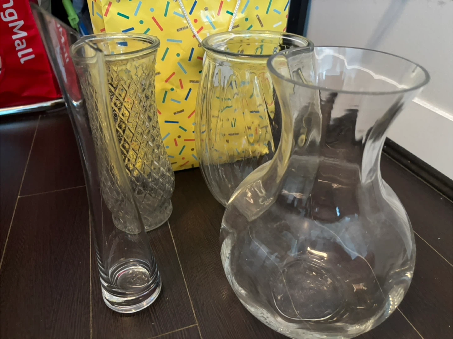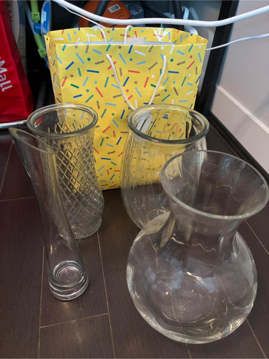 Selling a set of four clear glass vases! They're in great condition and ready to add a touch of elegance to your home. Perfect for displaying flowers or as decorative pieces on their own. They have been sitting in storage. Pick them up near Richmond Centre $8 for all