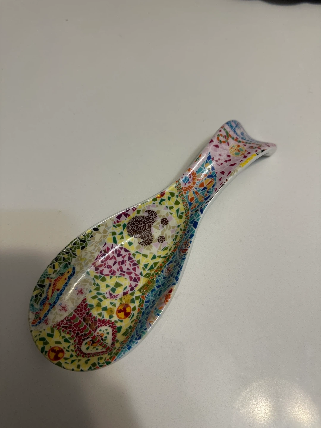 Here's a lovely mosaic spoon rest! It features a colourful mosaic design, perfect for adding a touch of brightness to your kitchen. It's in great shape and ready for a new home