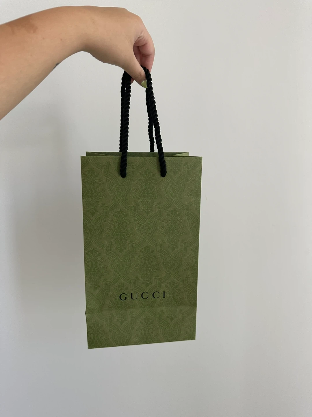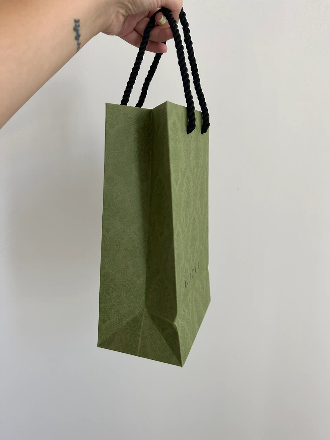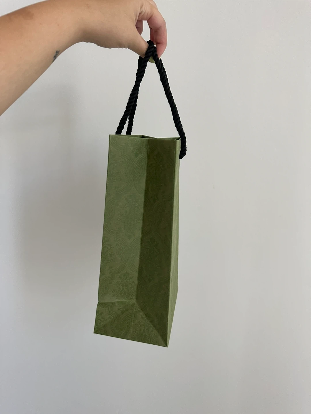Selling a Gucci gift bag. It's a lovely olive green colour with black rope handles. Perfect for gifting or storing items!