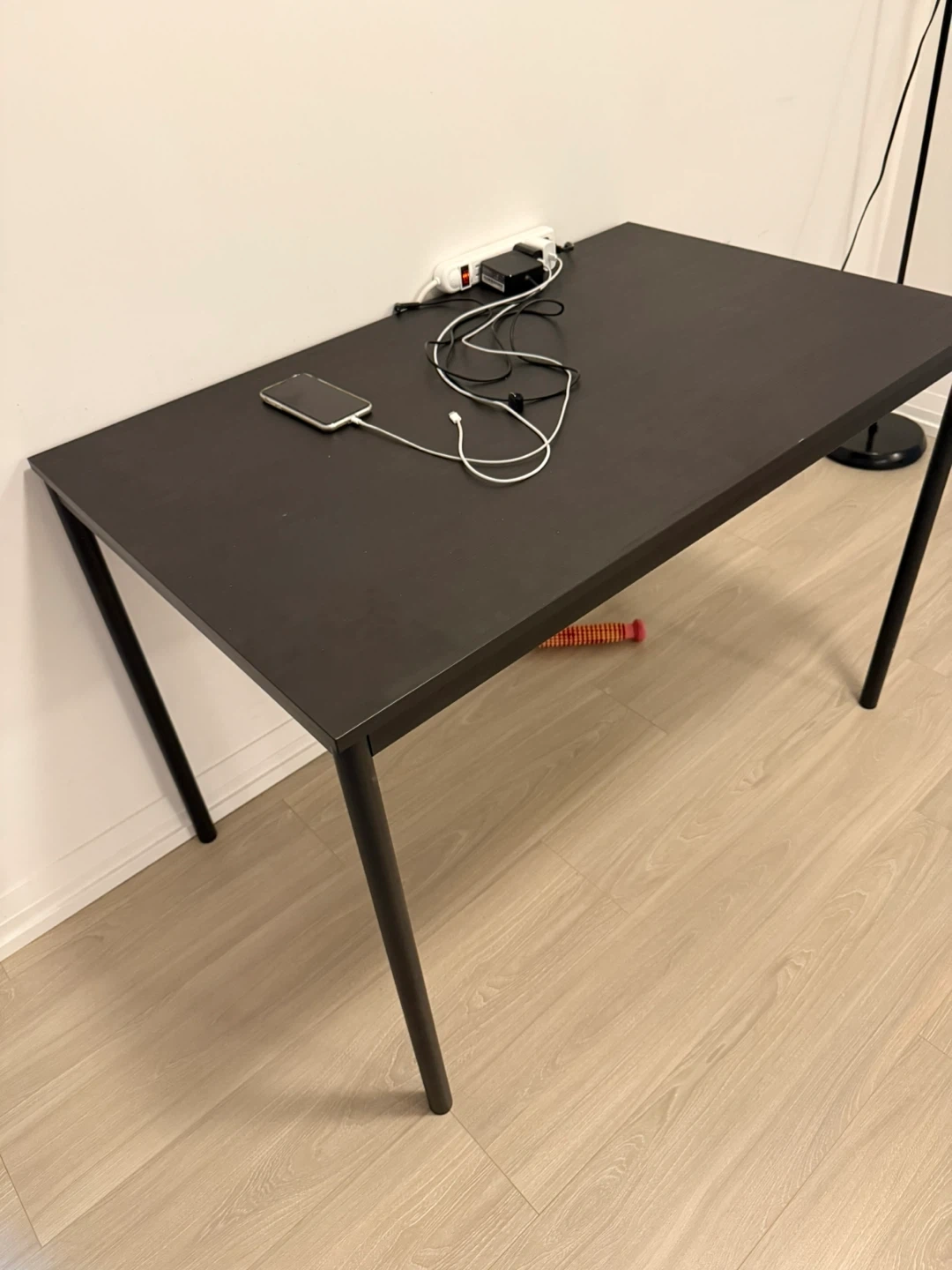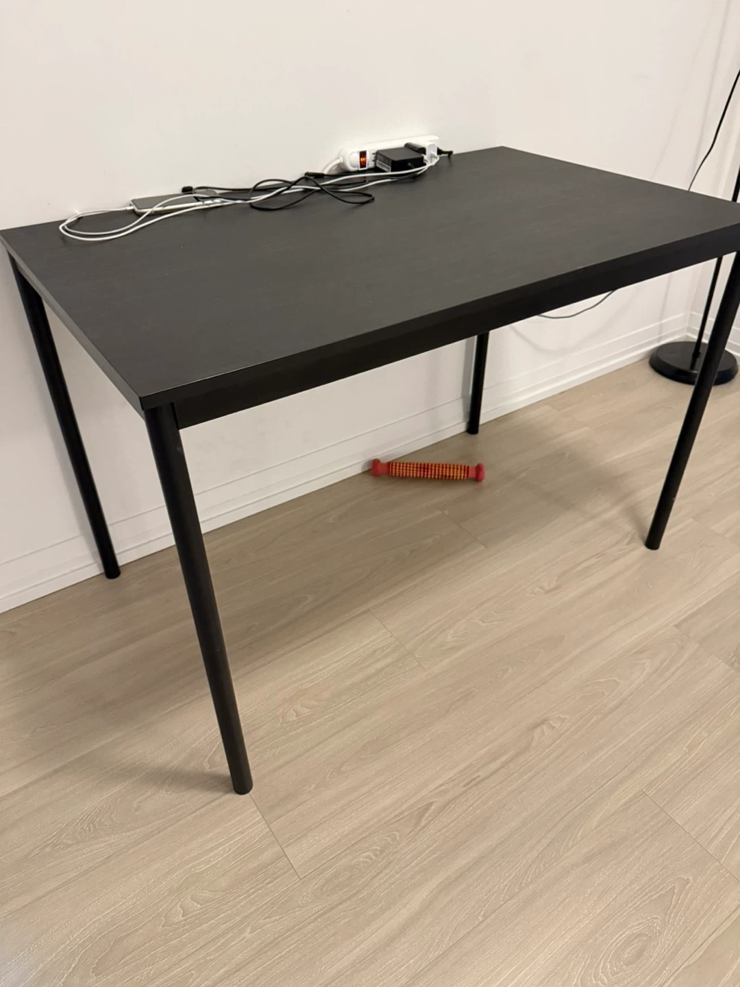 Selling a dark brown desk in good condition. It's a simple and sturdy desk, perfect for a home office or study space. It has a sleek design that fits well in various room settings. Feel free to reach out if you're interested!