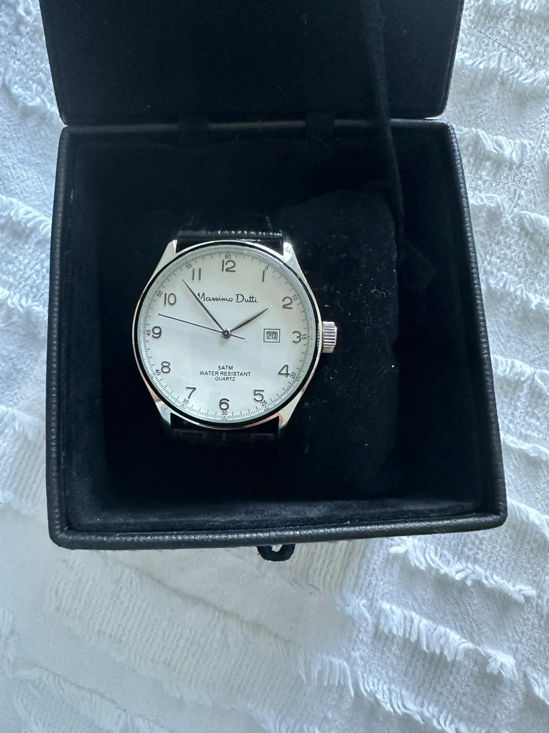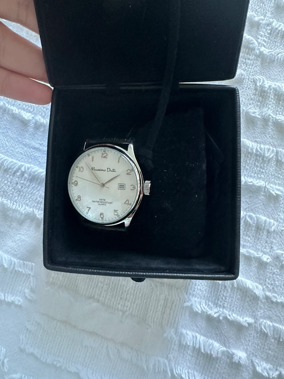 Selling a Massimo Dutti watch in great condition! It comes with its original box. The watch features a classic design with a white face and black leather strap. It's also water resistant. Perfect for everyday wear or a special occasion