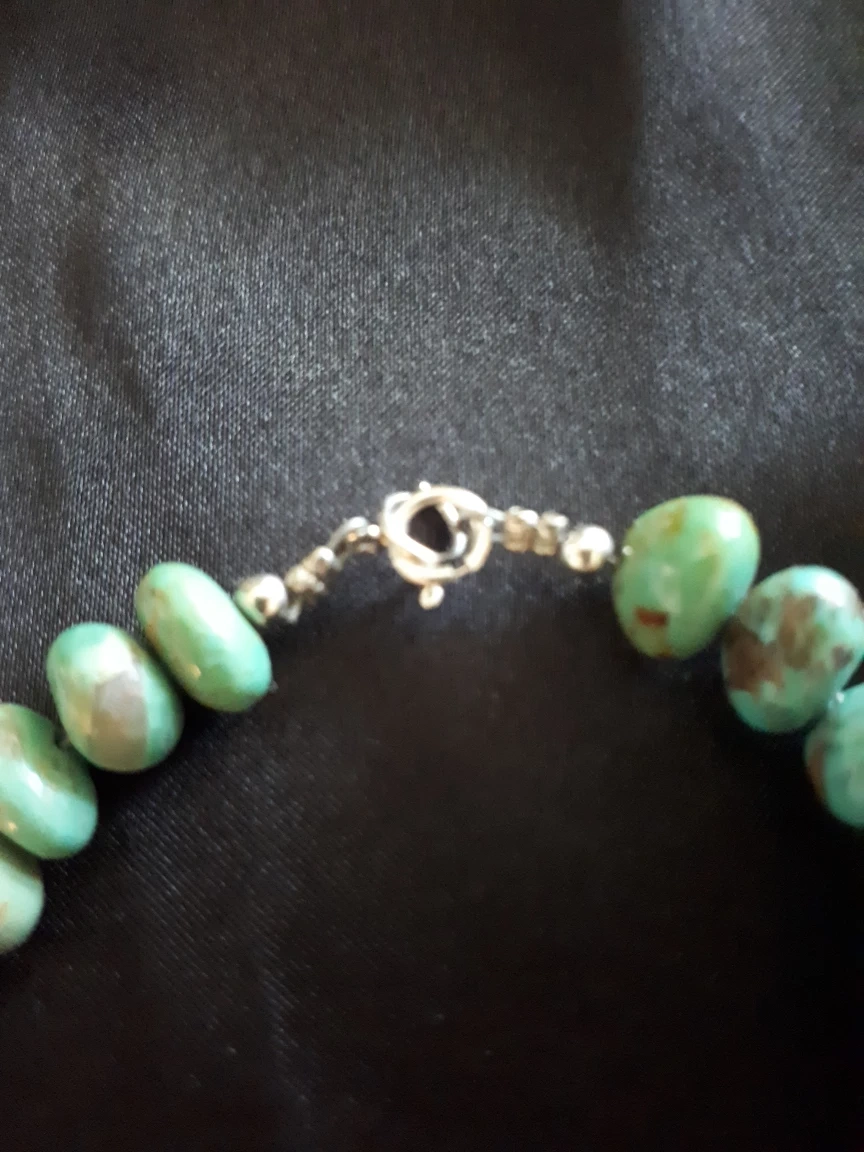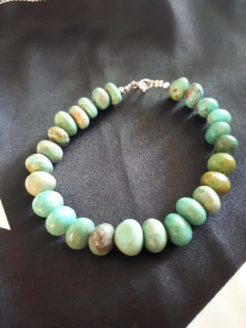 Here's a beautiful turquoise beaded bracelet! The beads have a lovely natural variation in colour, ranging from a light, bright turquoise to a deeper, more muted green. The clasp is silver-toned and in great working condition. It's a lovely accessory to add a pop of colour to any outfit