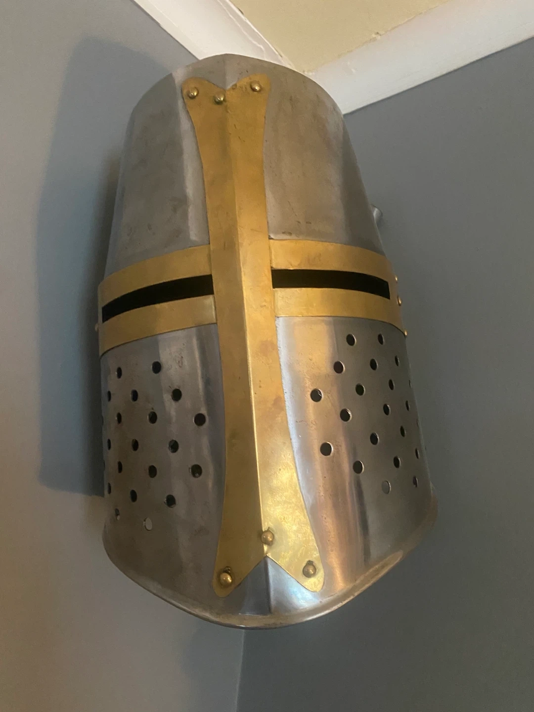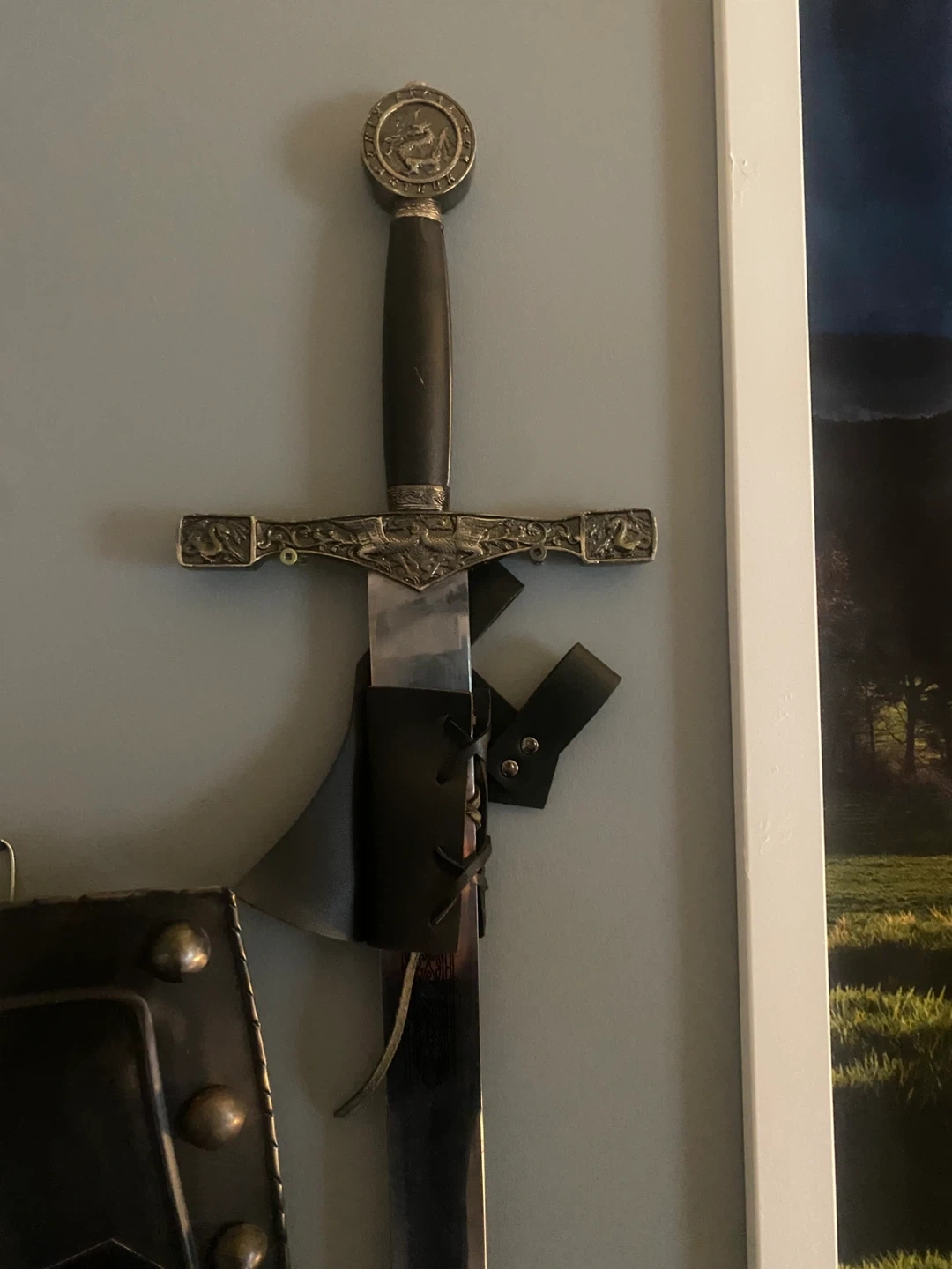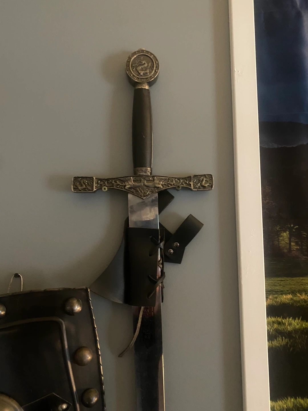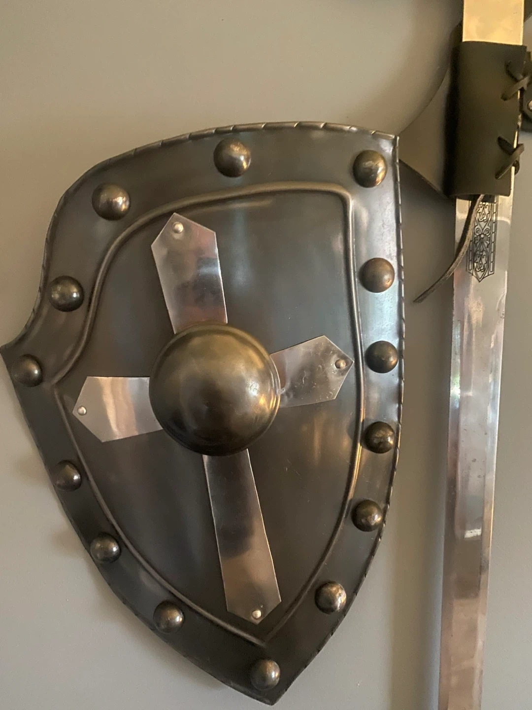 Selling a crusader sword and shield set. The sword has a decorative handle and blade, and the shield is metal with a cross design. Perfect for display or costume! Sword is King Arthur xcalibur replica