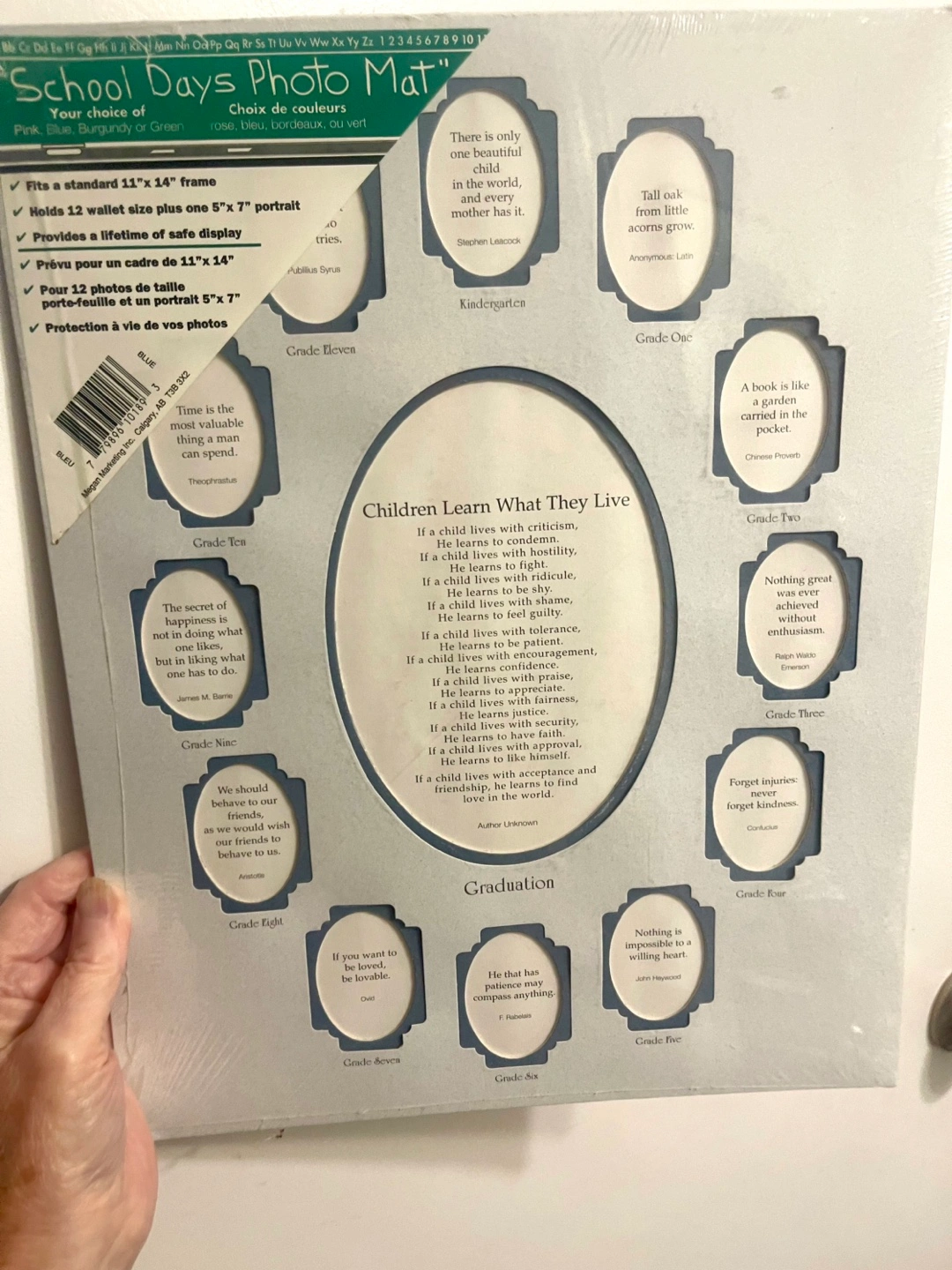 School Days Photo Mat for showcasing your child's school photos! - Fits a standard 11"x 14" frame - Holds 12 wallet size photos plus one 5"x 7" portrait - Provides a lifetime of safe display