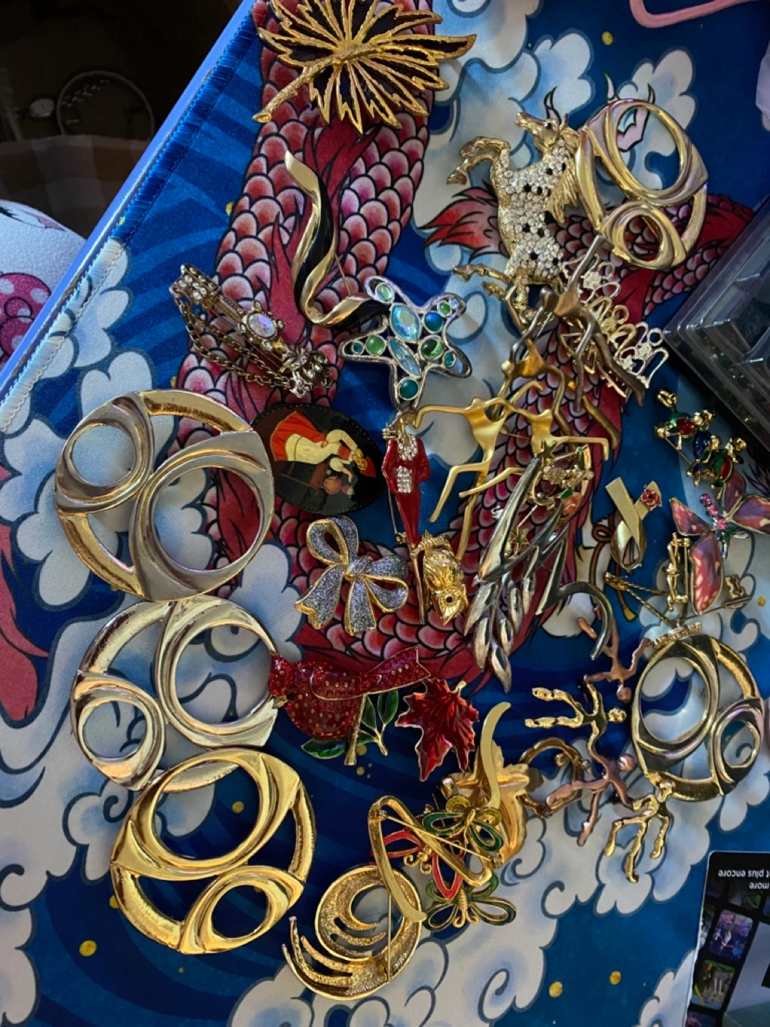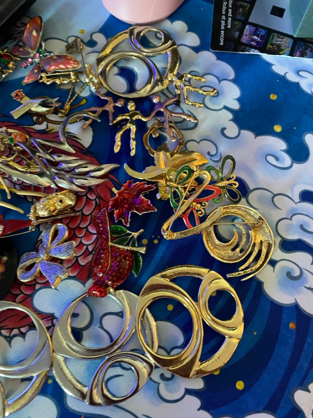 Selling a collection of vintage brooches. There's a variety of styles and designs, from floral to abstract, and some with rhinestones. Perfect for adding a touch of retro flair to your outfits!