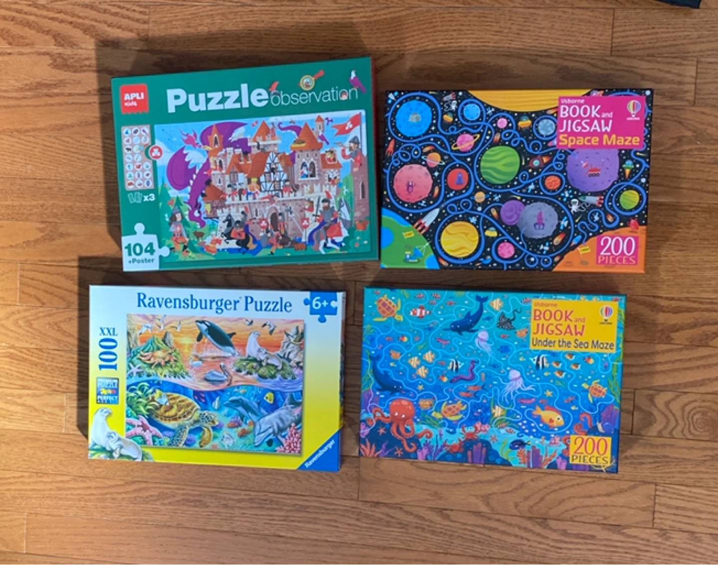Selling a collection of puzzles: - Usborne Book and Jigsaw Space Maze, 200 pieces - Usborne Book and Jigsaw Under the Sea Maze, 200 pieces - Ravensburger Puzzle, XXL 100 pieces - Apli Kids Puzzle observation, 104 pieces + Poster All in Pristine Condition $15 each or $50 for all of them
