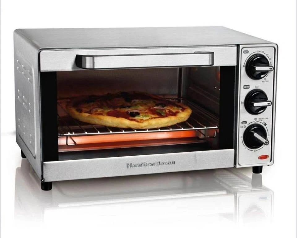 BRAND NEW β IN ORIGINAL BOX! Upgrade your kitchen with the versatile Hamilton Beach 31401C Toaster Oven & Pizza Maker β a full-featured countertop oven that bakes, broils, toasts, and even makes perfect 15" pizzas (yes, family-sized!) β all without heating up your full oven. π Why Youβll Love It: β Large 15" x 11.5" interior β fits a 15β pizza, 6 slices of toast, or a 4-lb chicken β Adjustable rack & 3 cooking functions: Bake, Broil, Toast β Built-in timer (up to 60 mins) with auto-shutoff β safe and convenient β See-through window & interior light β monitor food without opening the door β Stainless steel finish β modern look, easy to clean, durable β Perfect for small kitchens, dorms, RVs, or as a second oven β Energy-efficient β great for quick meals, reheating, or avoiding big oven use