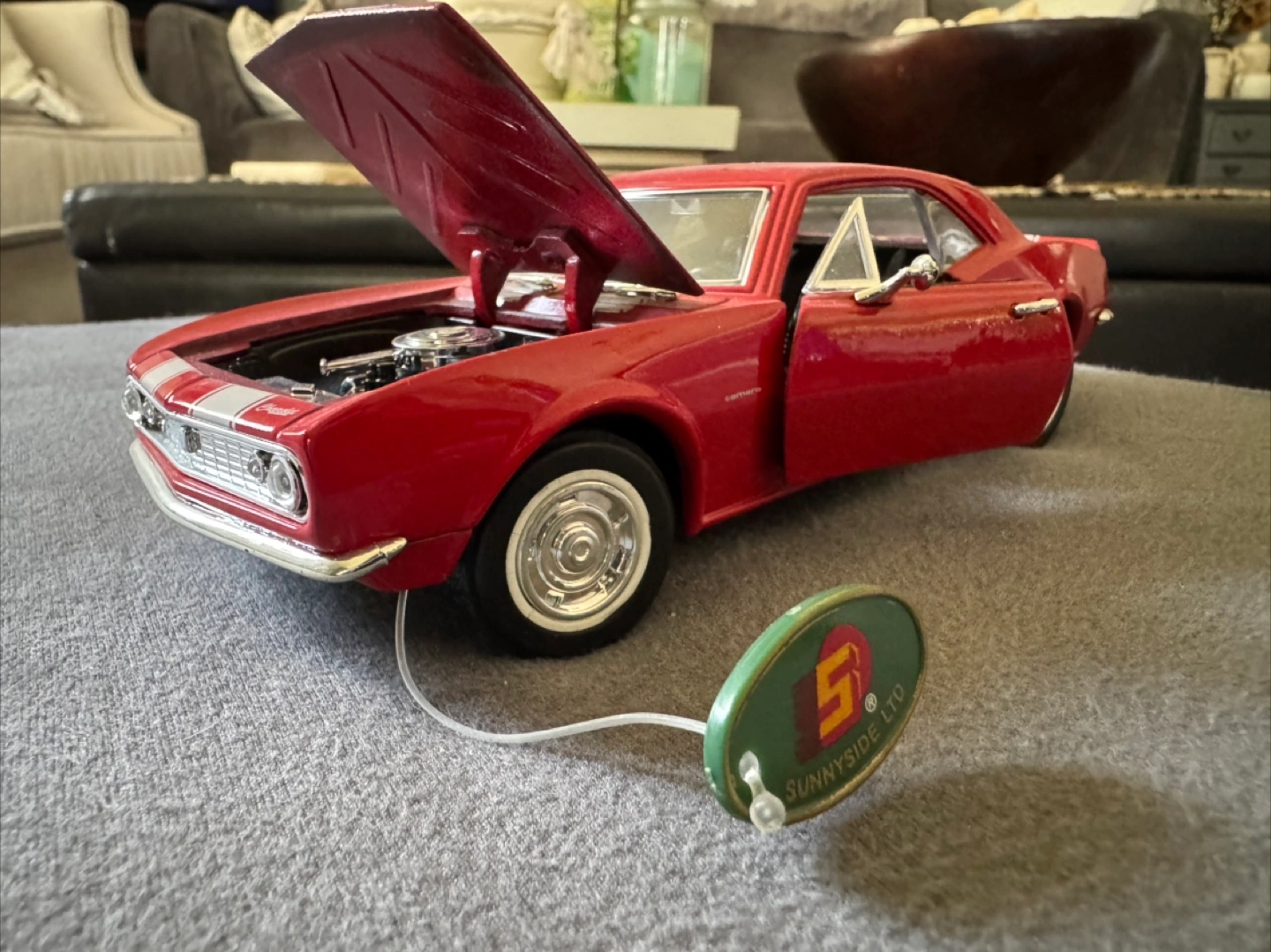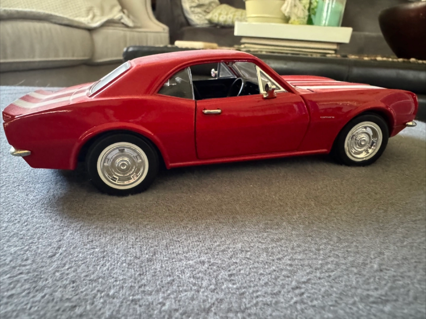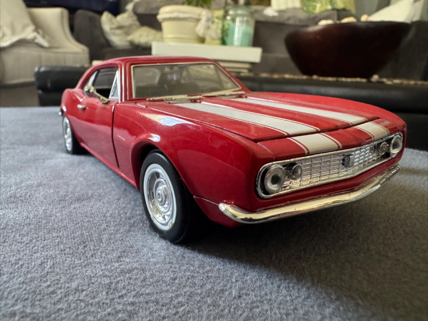 Here's a cool diecast model of a 1967 Chevy Camaro! It's a bright red colour with white racing stripes. The hood opens to show off the engine. A fun collectible for any car enthusiast!