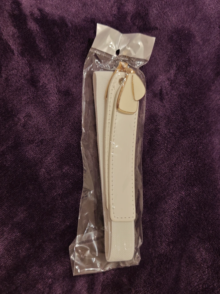 Selling a new white elastic belt! It's still in its original packaging. The belt has a gold-tone buckle and a white elastic band. Perfect for adding a touch of style to any outfit!