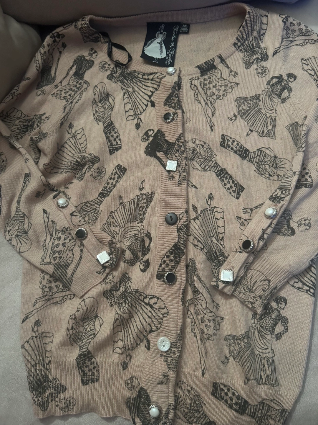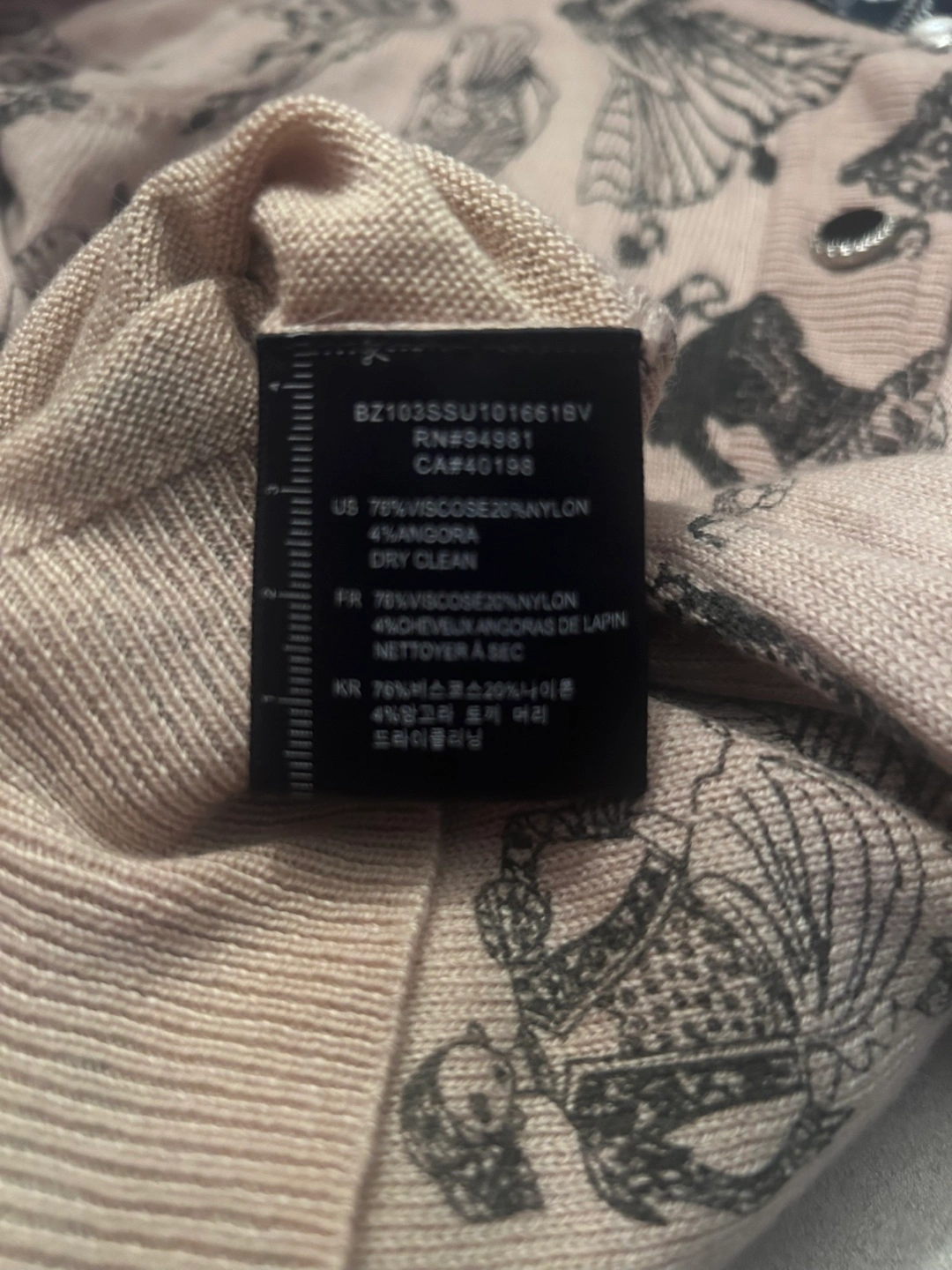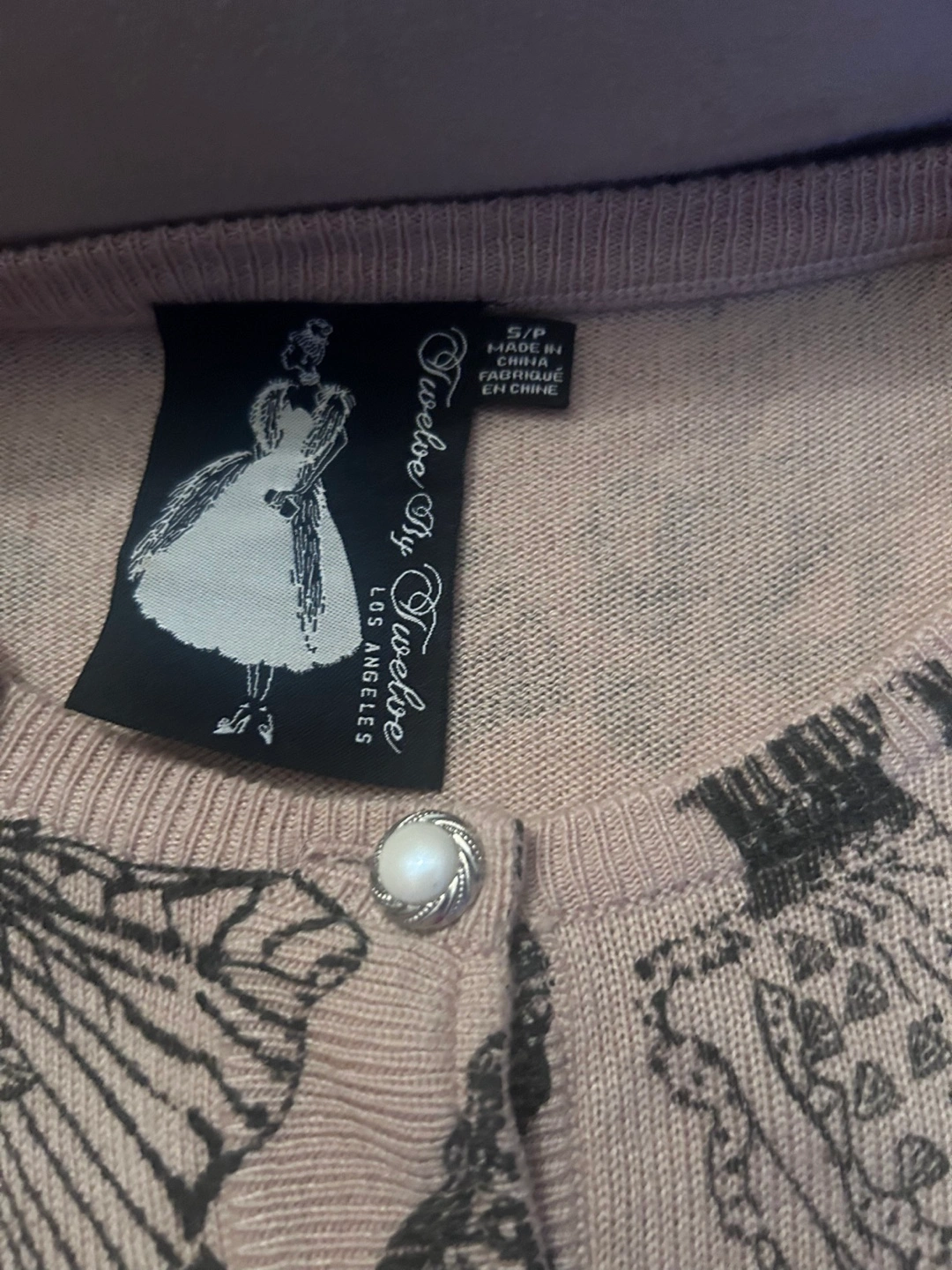 This is a Twelve by Twelve cardigan in size S/P. The material is 76% viscose, 4% angora, and 20% nylon. It has a unique design and is in good condition