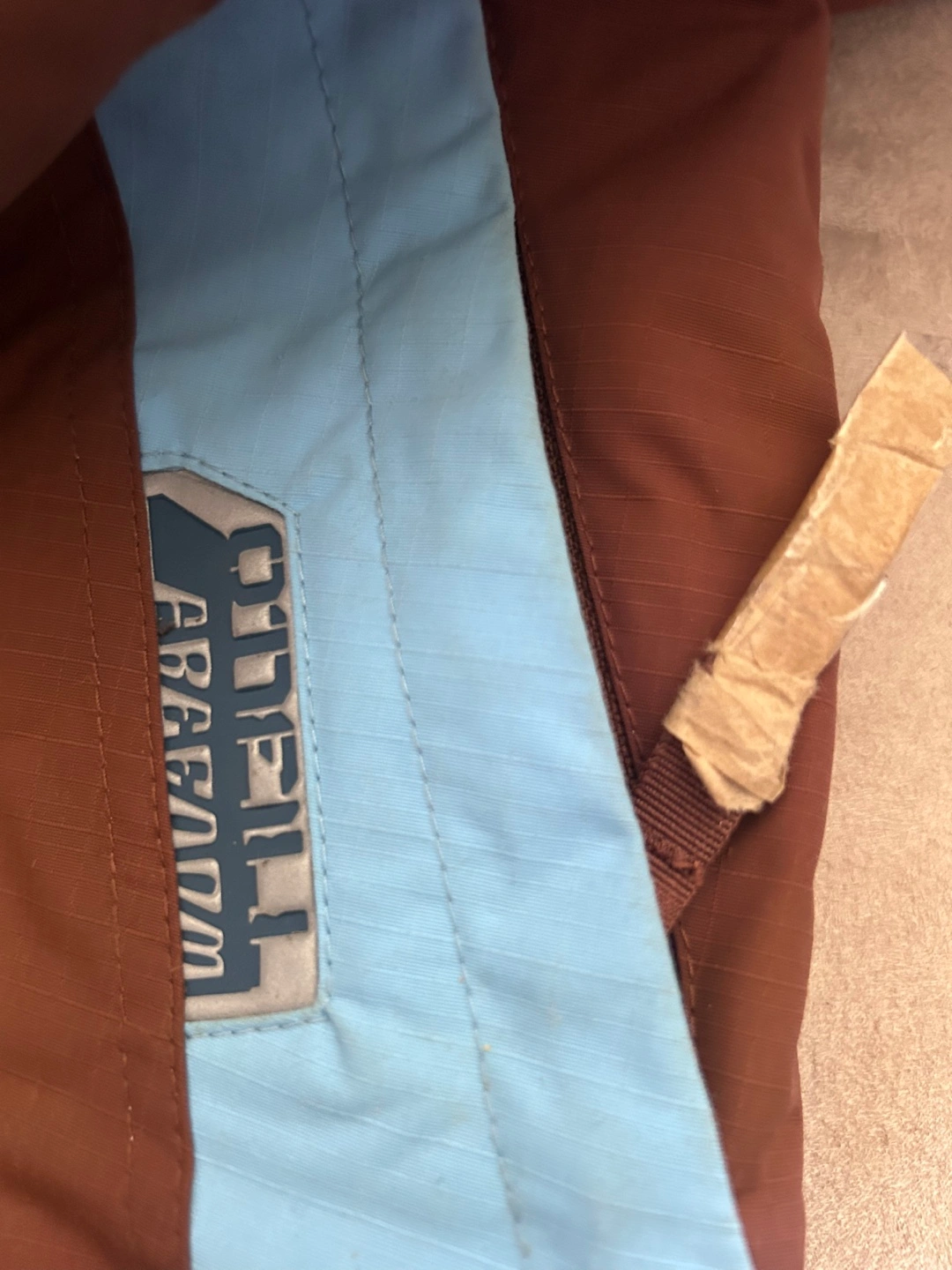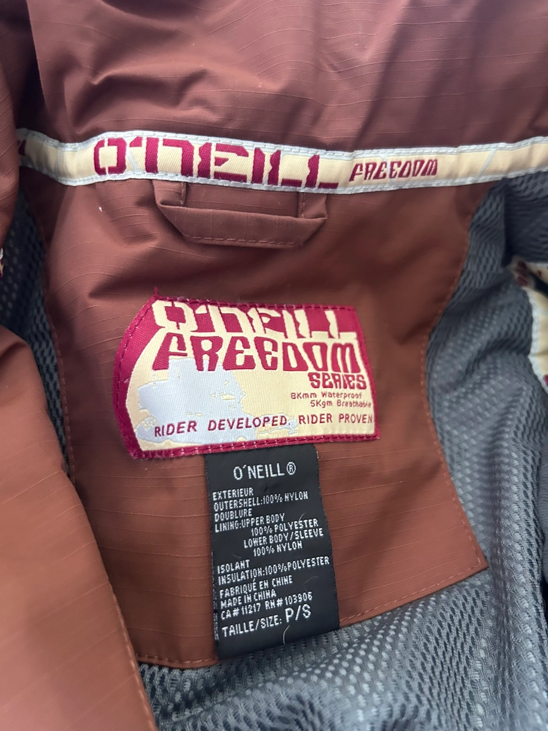 Selling an O'Neill Freedom Series jacket in size small. It's a stylish brown colour with light blue and yellow accents. The jacket is made of nylon and polyester, perfect for keeping you warm and dry. Great for outdoor activities! Comes with detachable hood