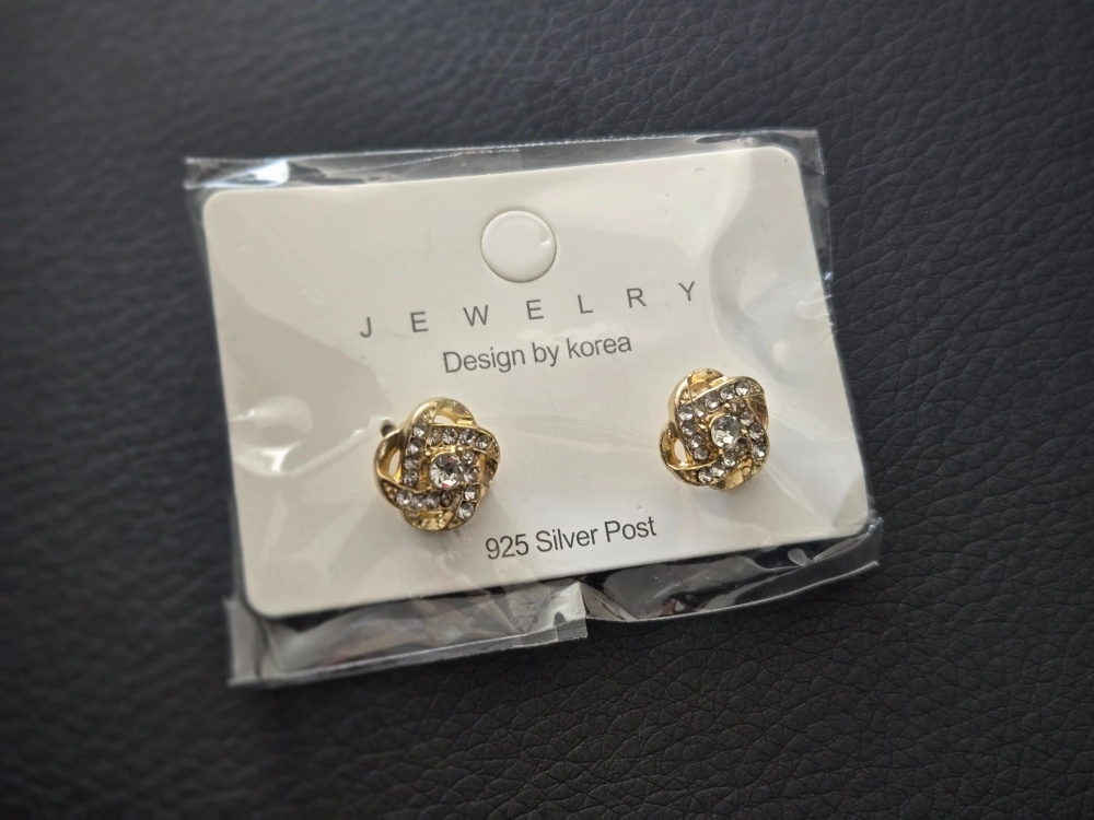 These are a pair of gold-coloured knot earrings with a flower design. They are still in their original packaging and have 925 silver posts. They are designed by Korea. Perfect for adding a touch of sparkle to any outfit!
