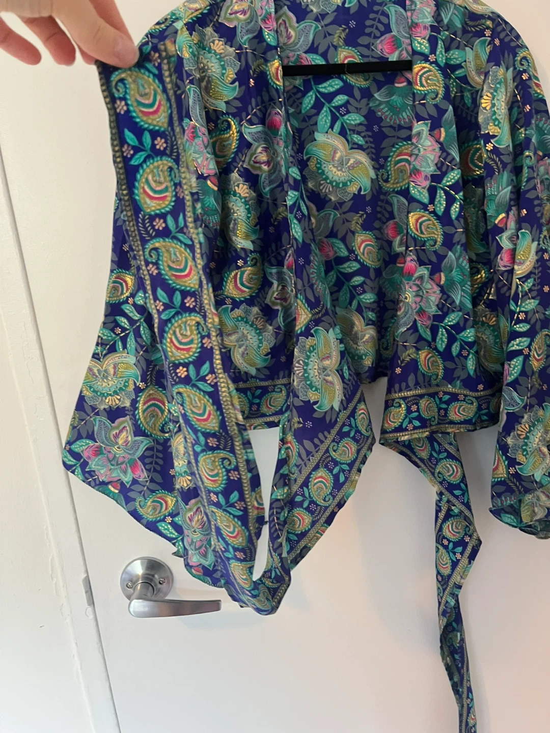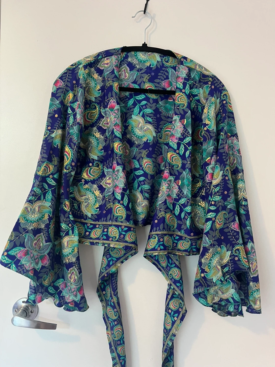 Purchased from a textile artist in BC. Brand new, never worn. Upcycled sari, beautiful colours. Fits a small or medium. Bell shaped arms. loose open front. cropped length. two long ties — could tie a bow on front or wrap the ties around your waist. Lovely, one of a kind. Pick up only near Bloor and Spadina. Originally $80, asking $35, make an offer ⭐️