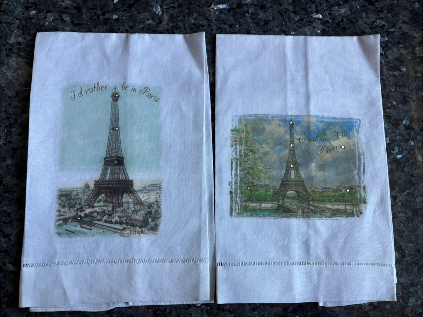Beautiful, high quality Paris-themed tea towels. Purchased from Putti. Condition: New - have been stored in plastic since purchased. No stains etc.