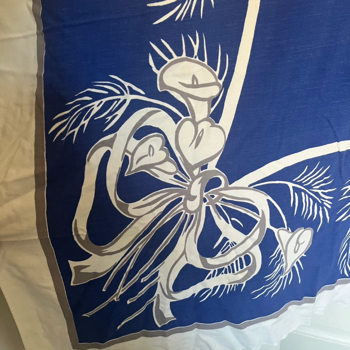 This is a beautiful table cloth with a striking blue and white floral design.