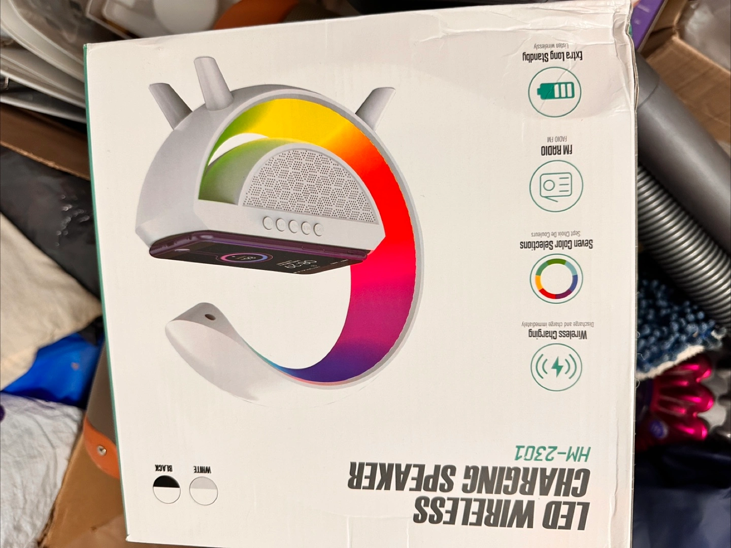 Selling an LED wireless charging speaker, model HM-2301! It features: - Wireless charging capability - Seven colour selections - FM radio - Extra long standby