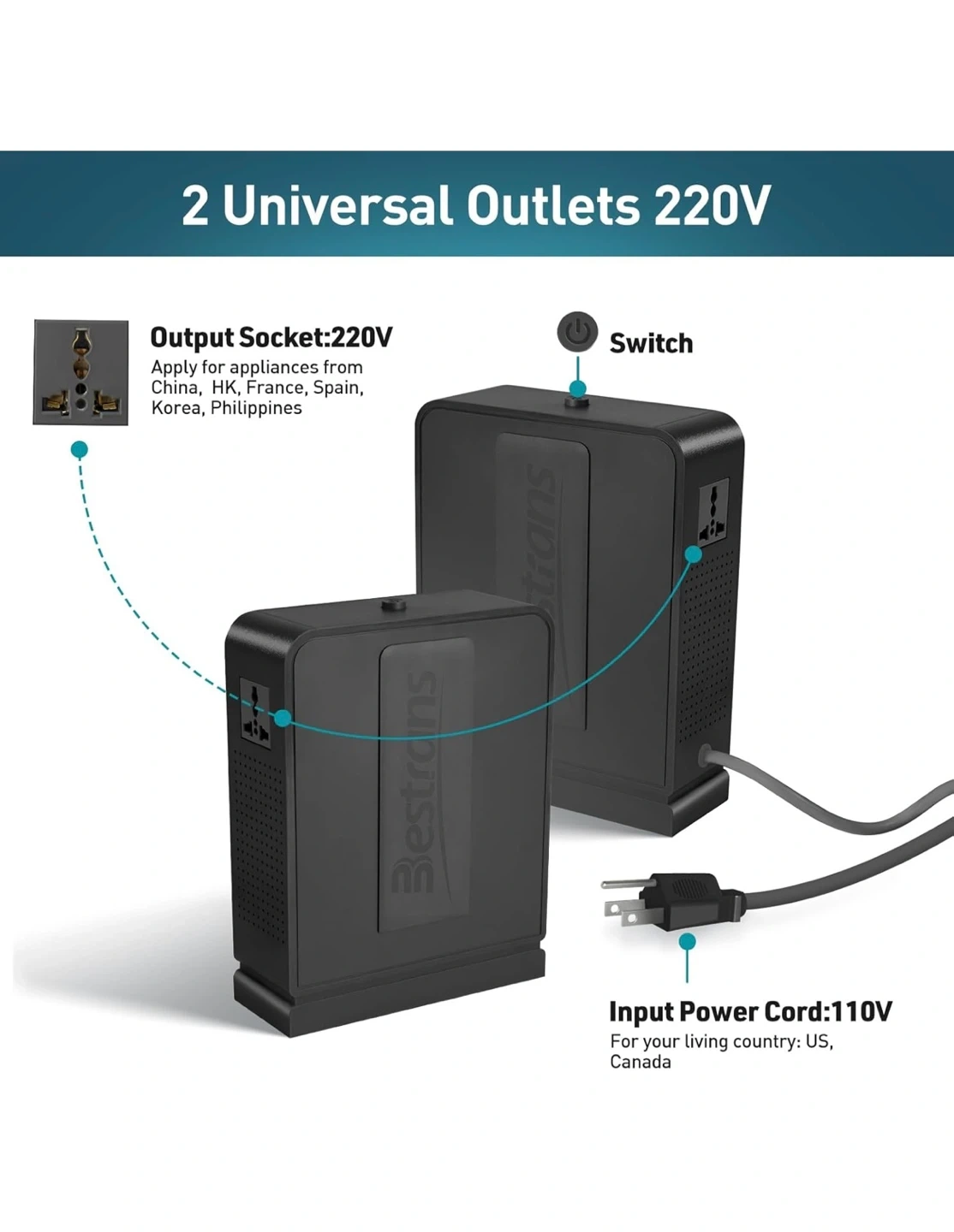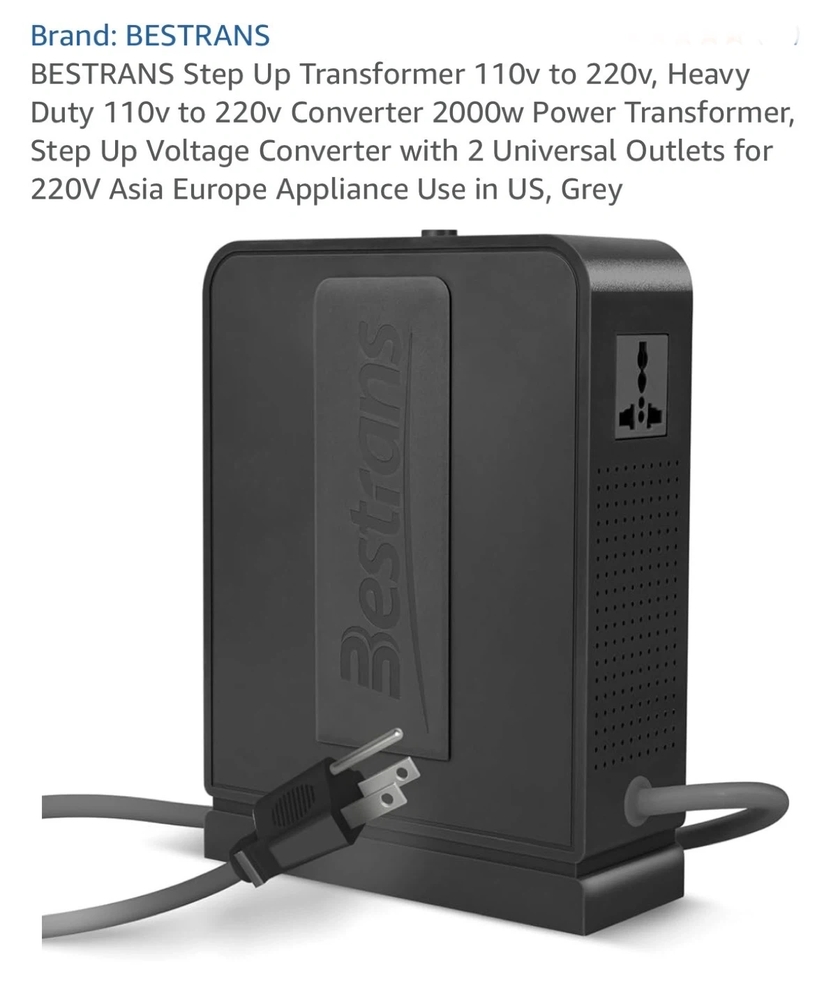 Selling a Bestrans Step Up Transformer, which converts 110v to 220v. It's a heavy-duty 110v to 220v converter with 2000w power. It also features 2 universal outlets for 220V Asia Europe appliances. Ideal for use in the US and Canada!