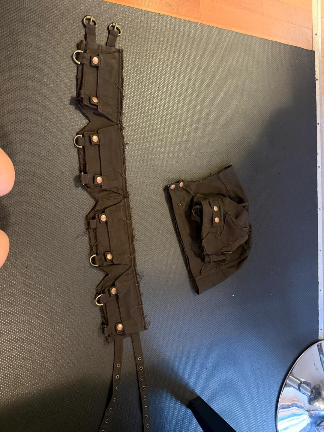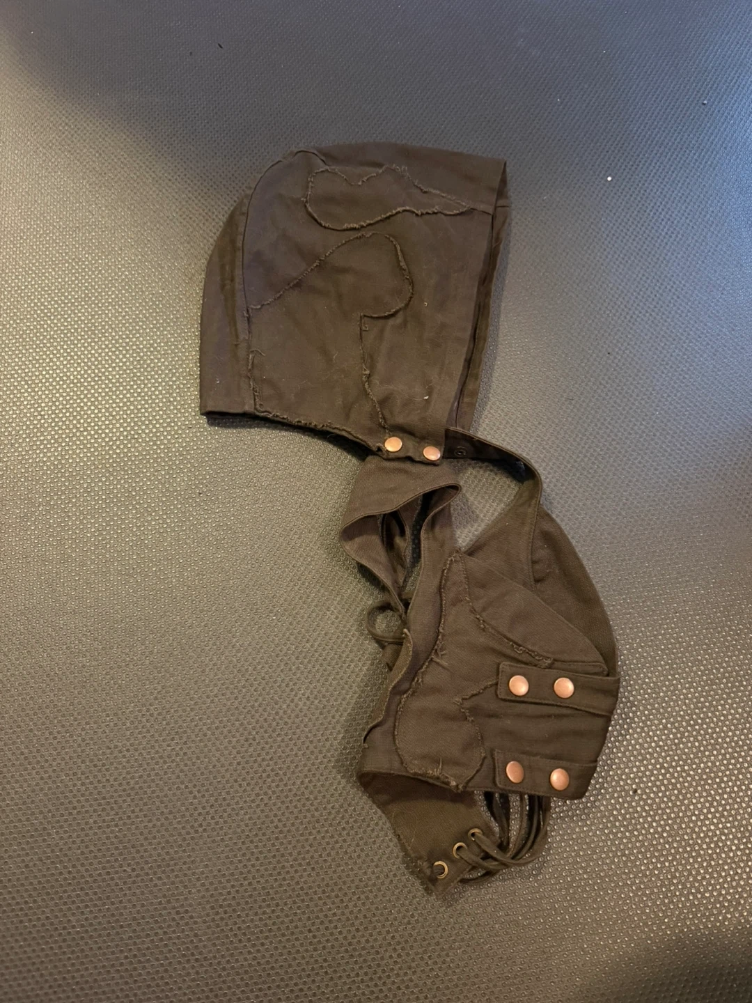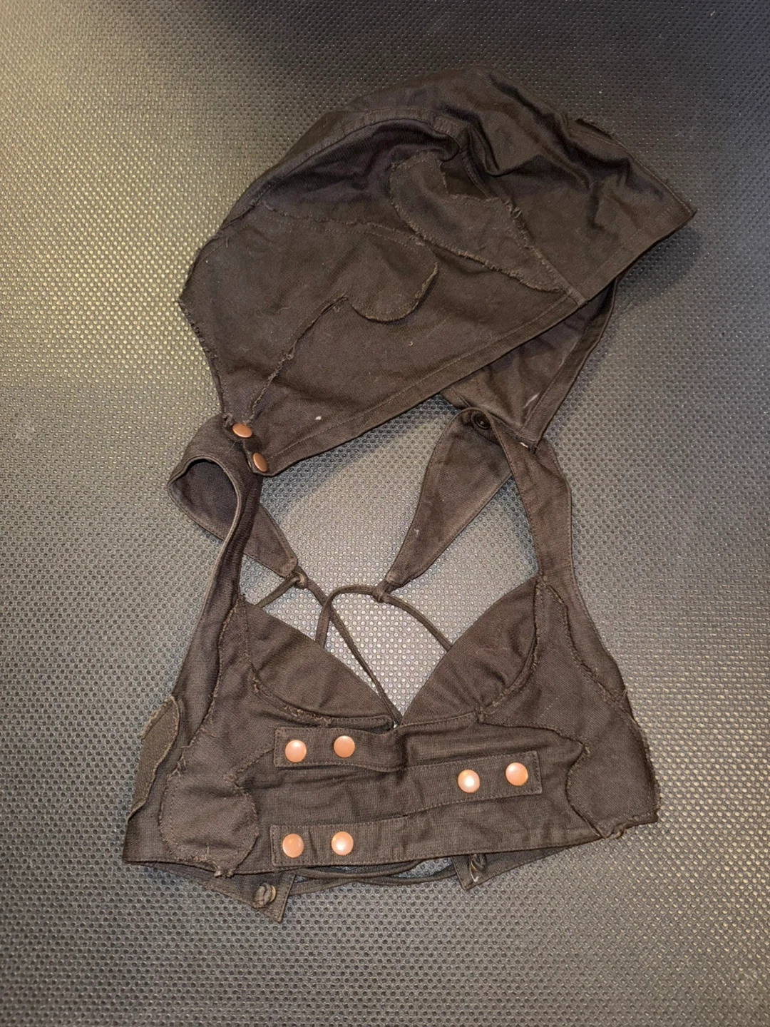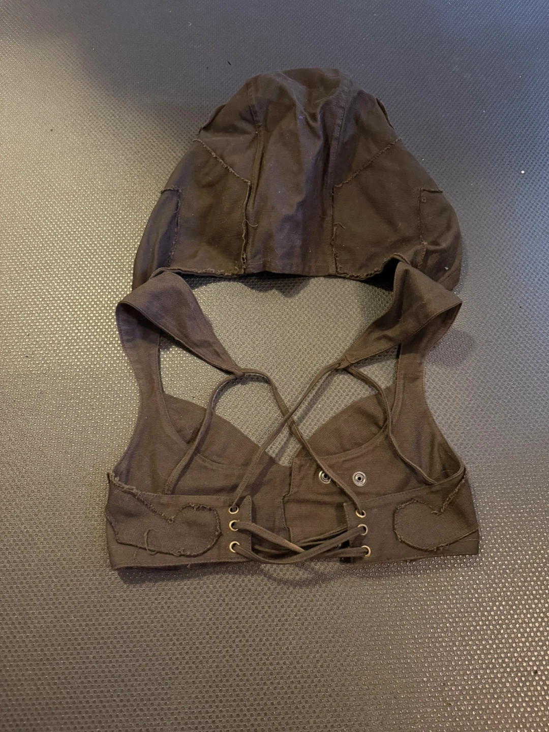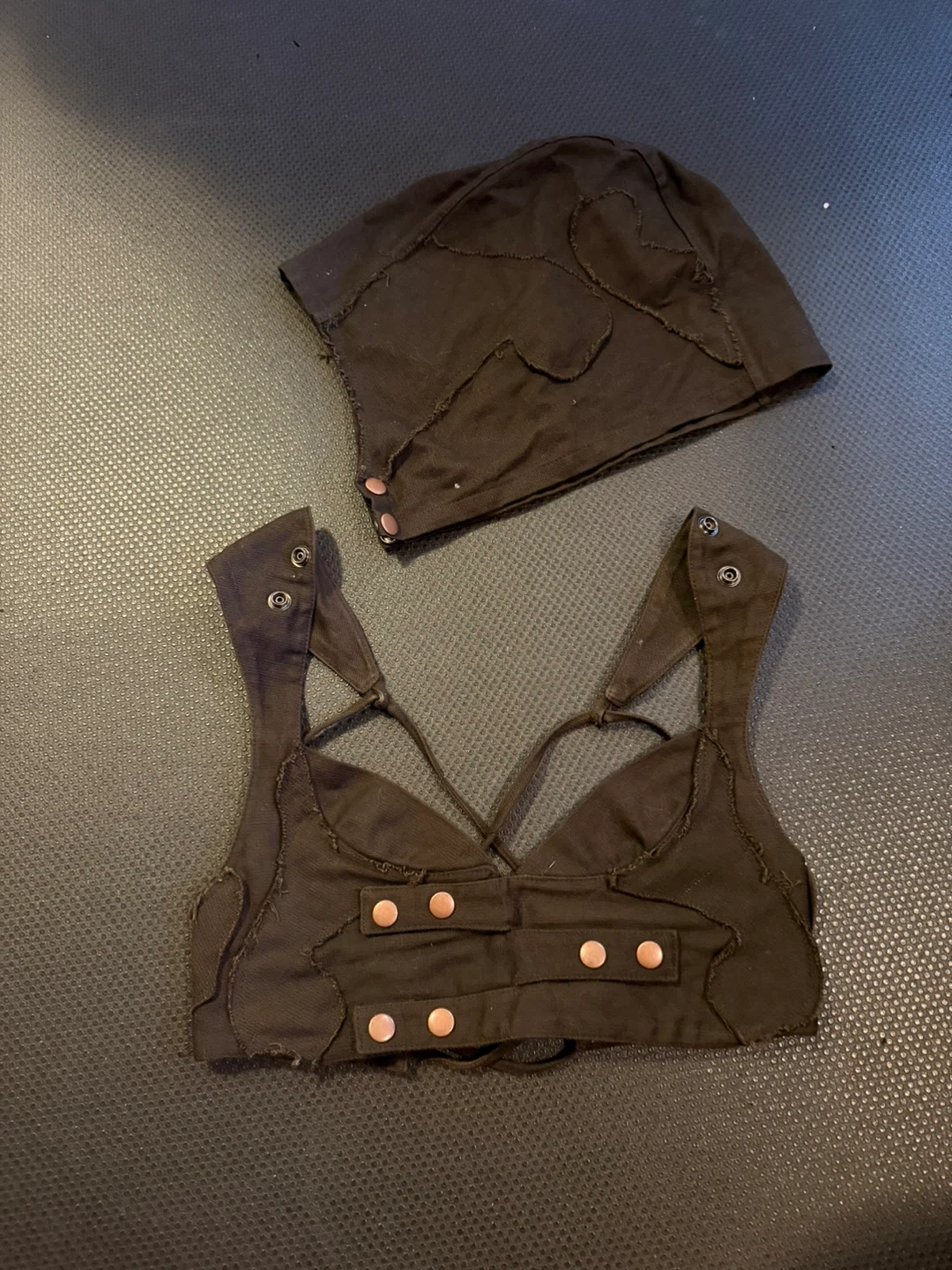 Selling a cute brown top and hood set from Rabbit and Empee Rande! The top has a unique design with button details and a strappy back. The hood complements the top perfectly for a stylish look. Comes with matching utility belt!