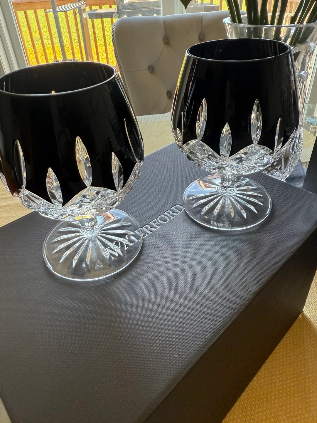 Here's a beautiful set of Waterford brandy glasses! They feature a striking black design on top of the classic Waterford crystal cut. Comes with the original box, perfect for gifting or adding a touch of elegance to your home bar