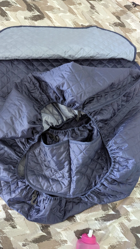 Keep your little one warm and cozy with this stroller cover ! It's designed to fit most single strollers and provides protection from the rain or snow. the backside has a mommy case to keep stuff too. Perfect for those chilly Canadian days!