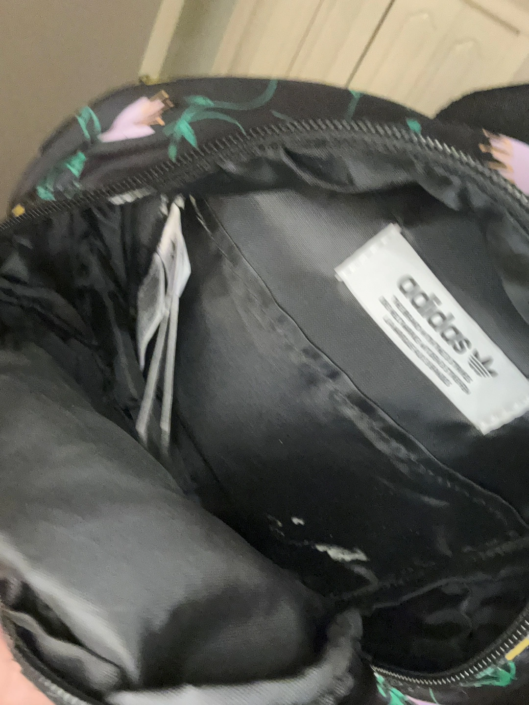 Check out this adorable Adidas mini backpack! It features a fun floral print on a black background. Perfect for carrying your essentials in style.