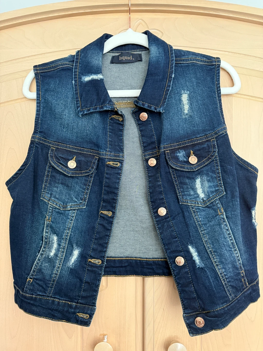 Here's a stylish denim vest from Liquid X! It's a great layering piece for any outfit. The vest has a classic blue denim wash with a distressed look. It features front pockets and button-down closure. Perfect for adding a bit of edge to your wardrobe!