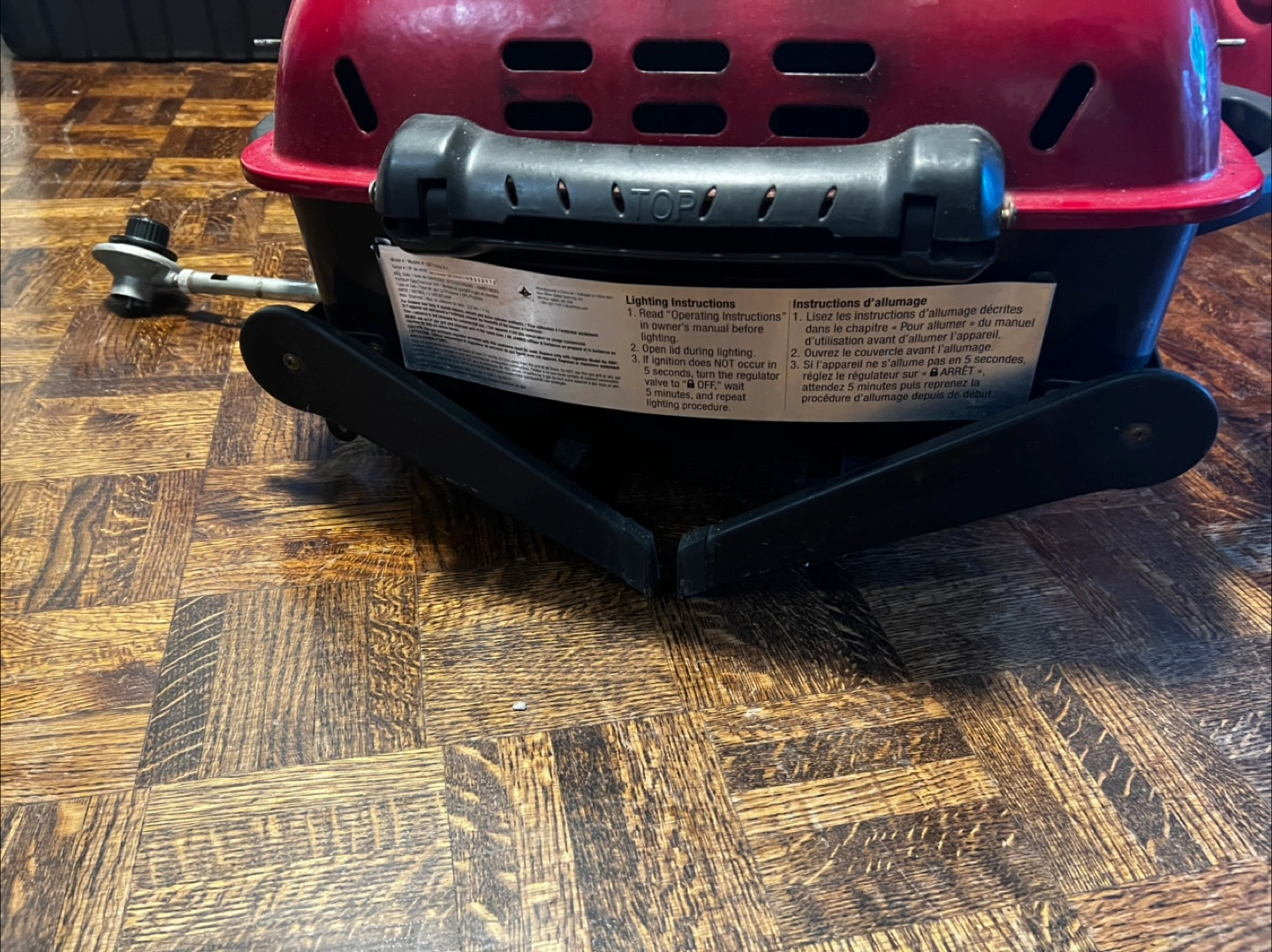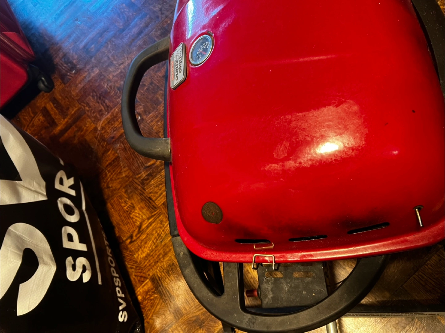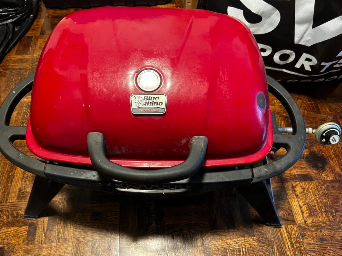 Selling a used Blue Rhino Crossfire portable grill. It's red and has a built-in thermometer. Has some a few cosmetic patches please refer to photos. Otherwise works fine and ready to go