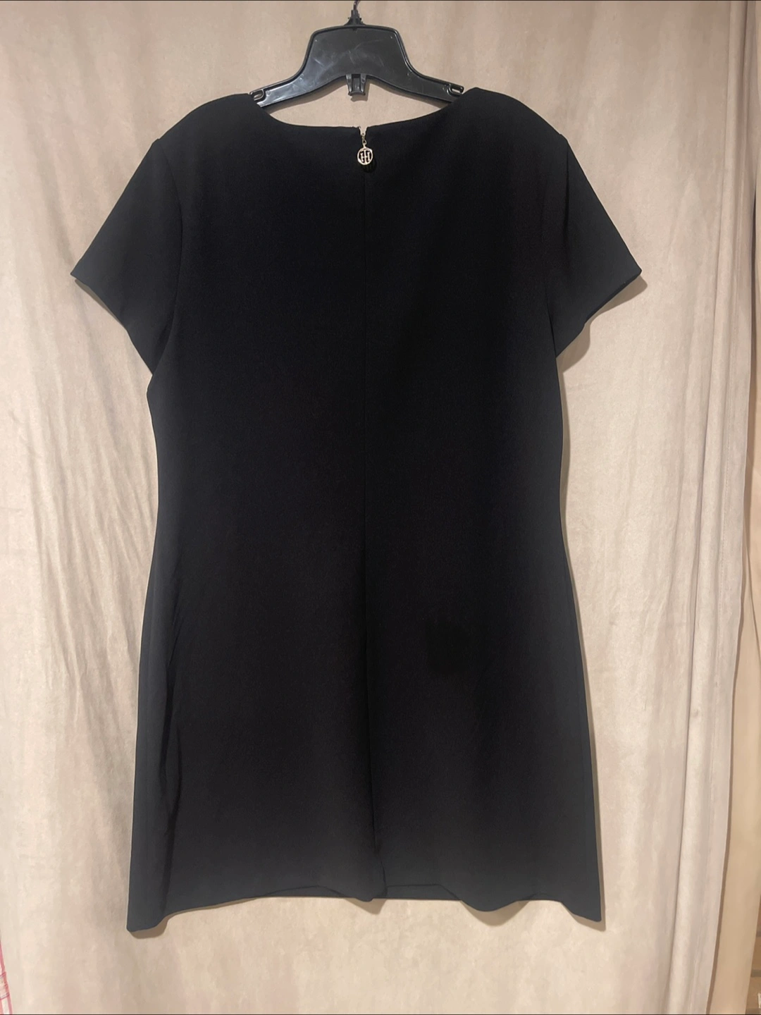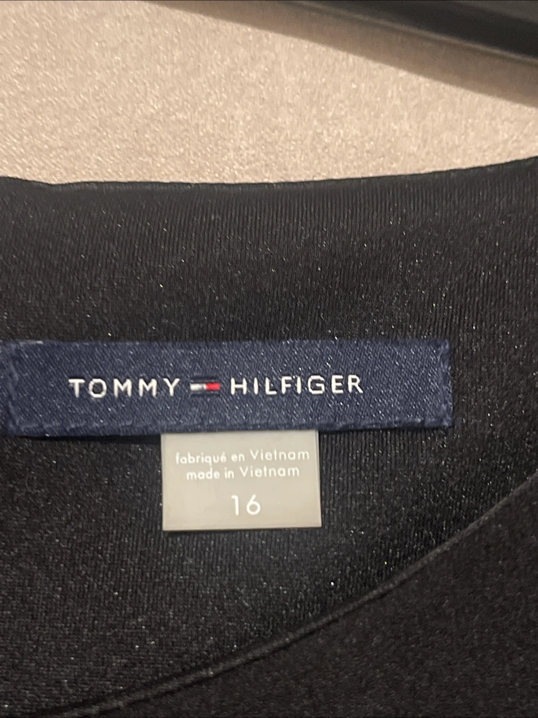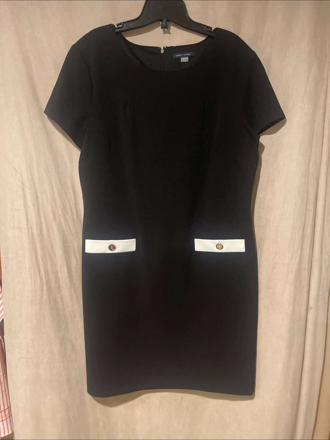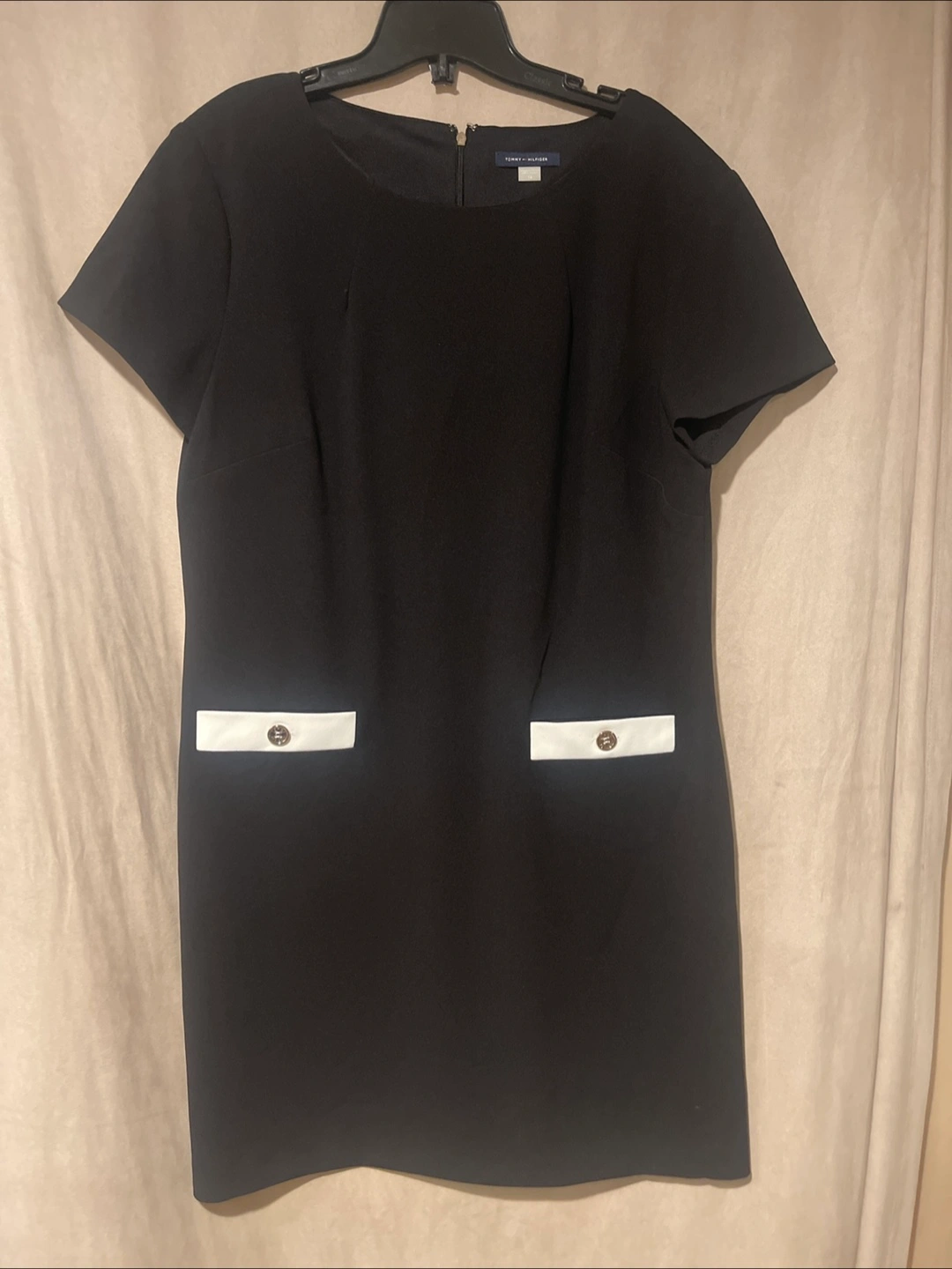 I'm selling a Tommy Hilfiger black dress in size 16. It's in great condition and features stylish white accents. Perfect for any occasion!