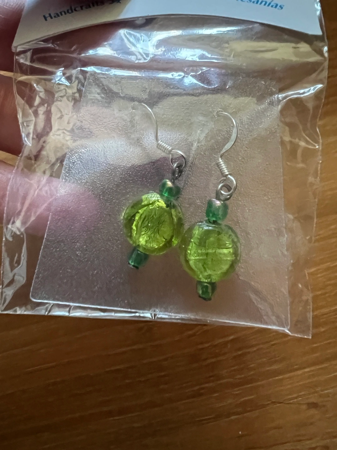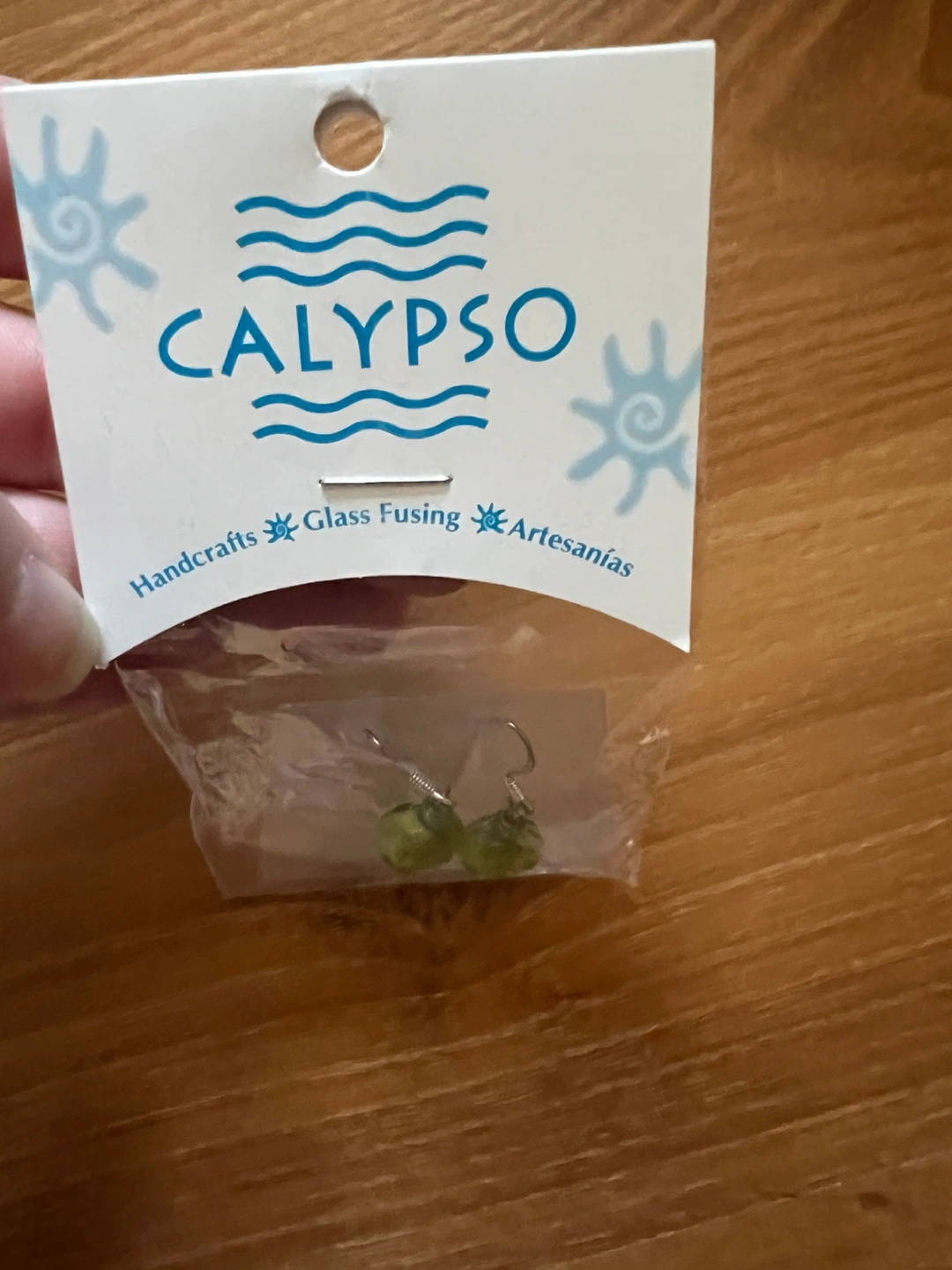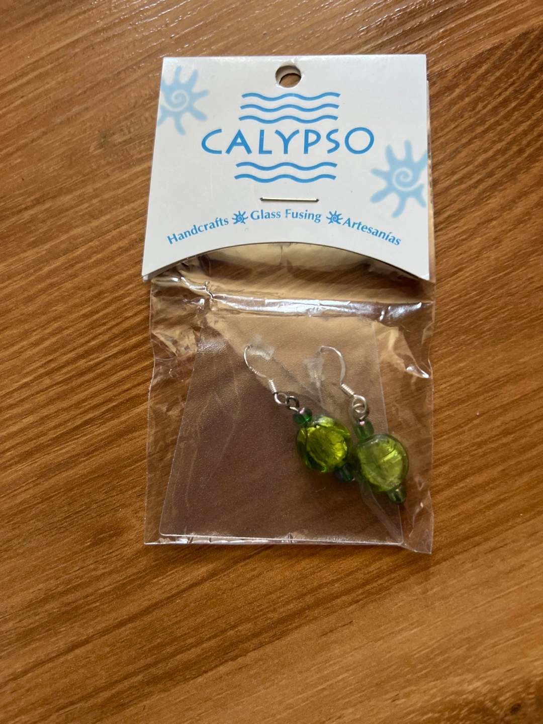 These are a pair of Calypso green bead drop earrings. They are new and still in the original packaging. They feature handcrafted glass fusing. Smoke free home Pick up near Glenanna Road and Hwy 2