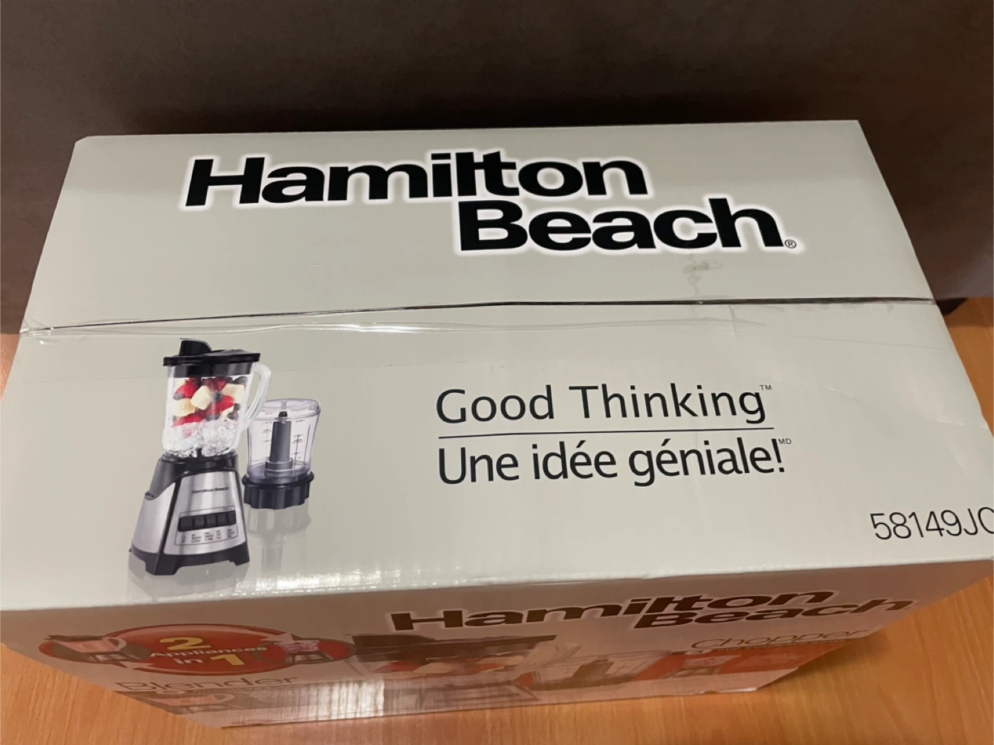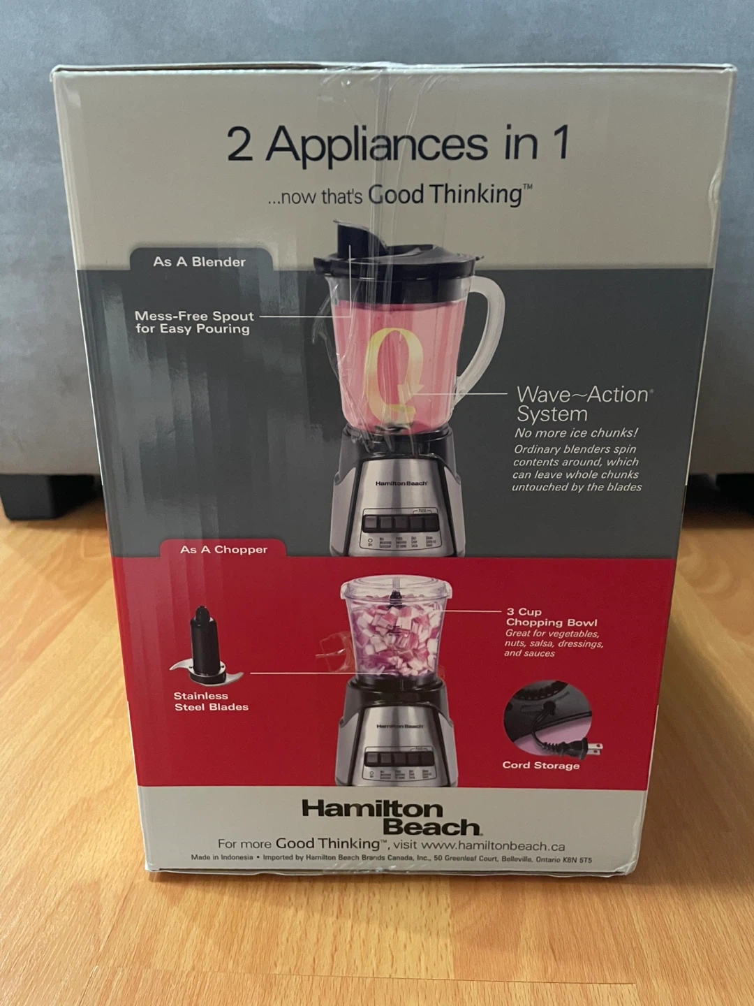Selling a brand new Hamilton Beach 2-in-1 Blender and Chopper! It's still in the box and ready to go. - 2 Appliances in 1: Blender and Chopper - 5 Cup Glass Jar - 3 Cup Chopping Bowl - Wave-Action System: No more ice chunks! - 700 Watt Peak Power - Mess-Free Spout - Dishwasher Safe Containers - 2 Speeds Plus Pulse - Cord Storage