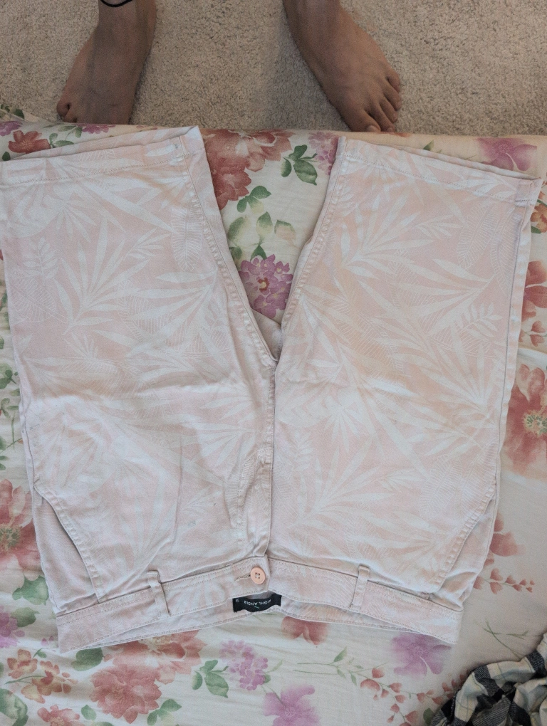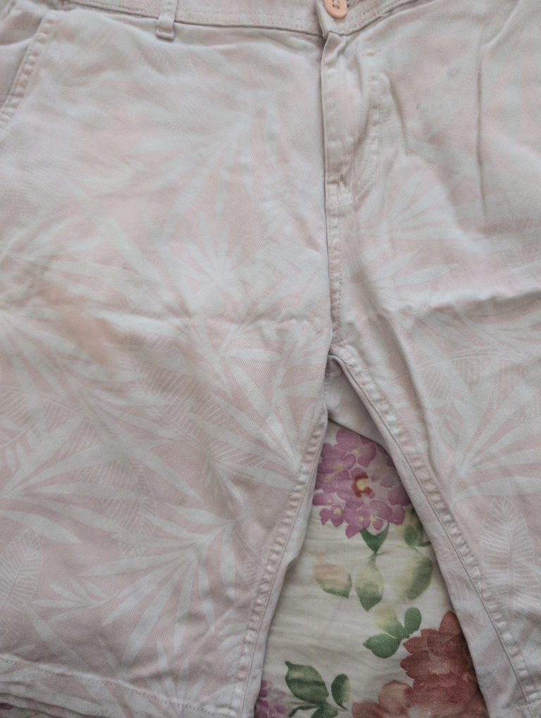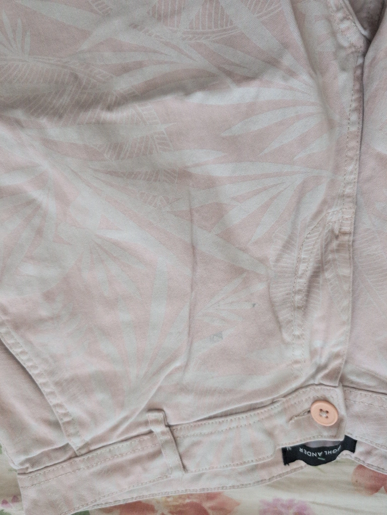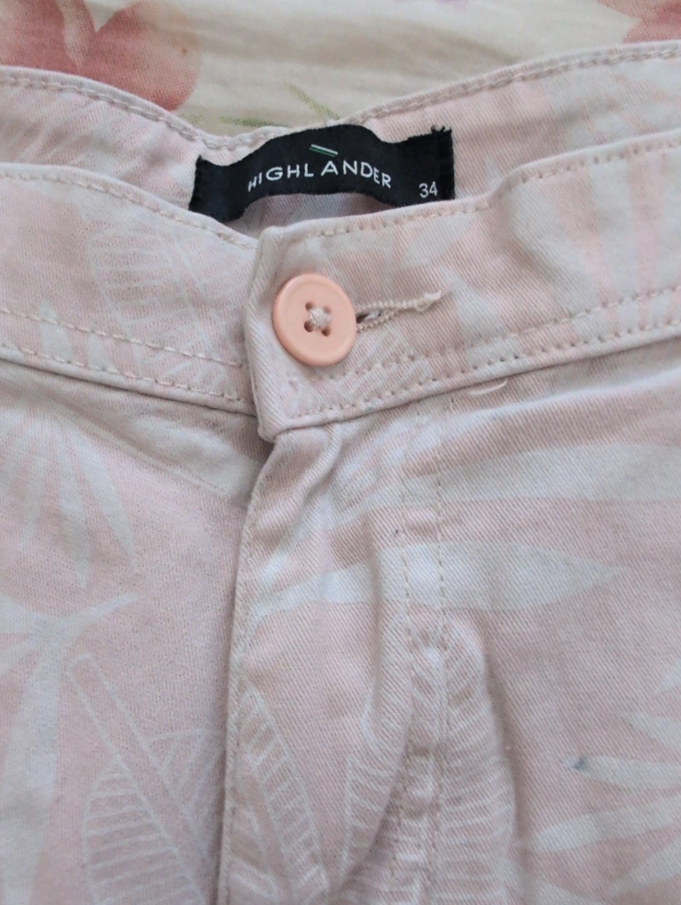 Selling a pair of Highlander shorts in size 34. They have a light pink colour with a subtle leaf pattern. Perfect for a casual summer look!