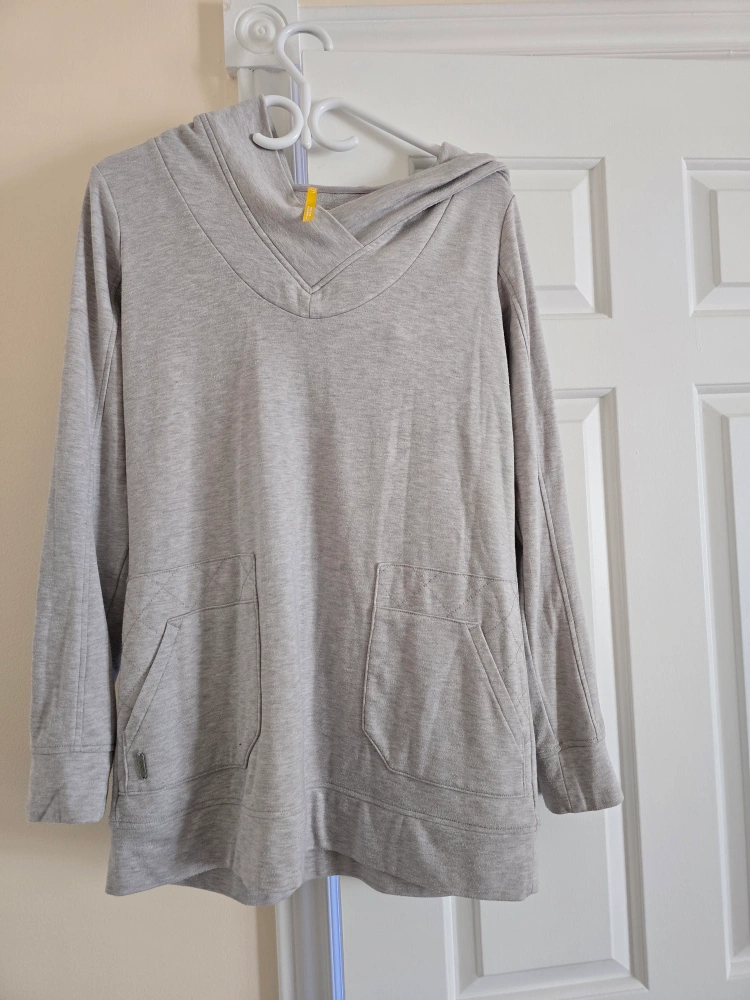 Cozy Lole hoodie in a lovely light grey colour. It's a size small and features a comfortable, relaxed fit. Perfect for layering or wearing on its own for a casual look! It has a hood and two front pockets