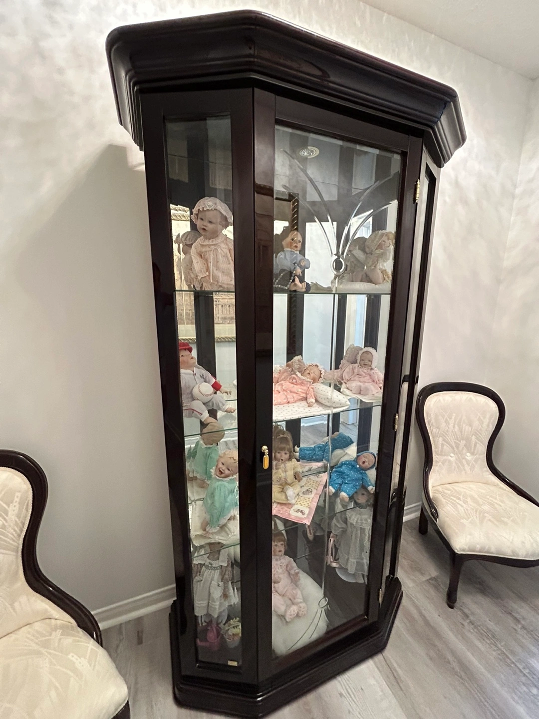 DOLL ARE NOT INCLUDED. Selling a curio cabinet with a dark brown finish. It's in great condition and perfect for displaying your collectibles or dolls. The cabinet features glass shelves and a mirrored back to enhance the display. It can also be used for storing glassware or other decorative items in your living room or dining area