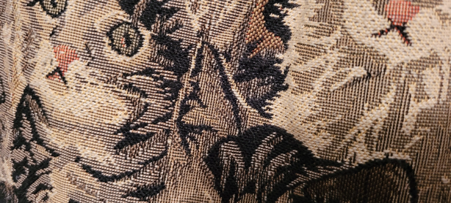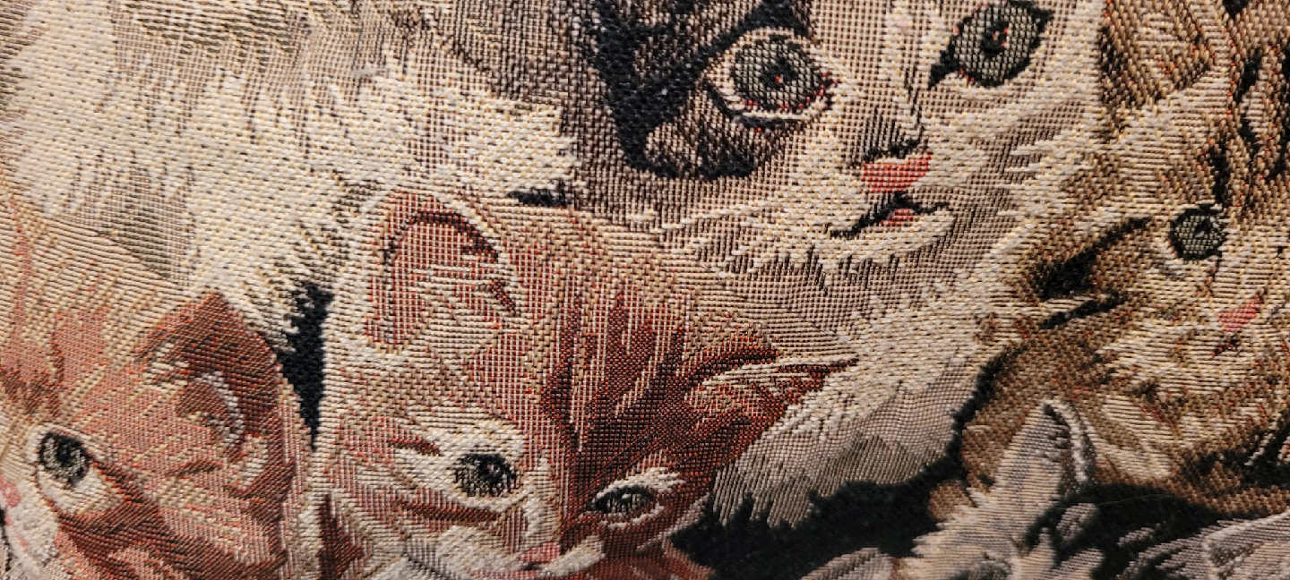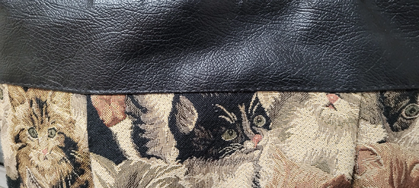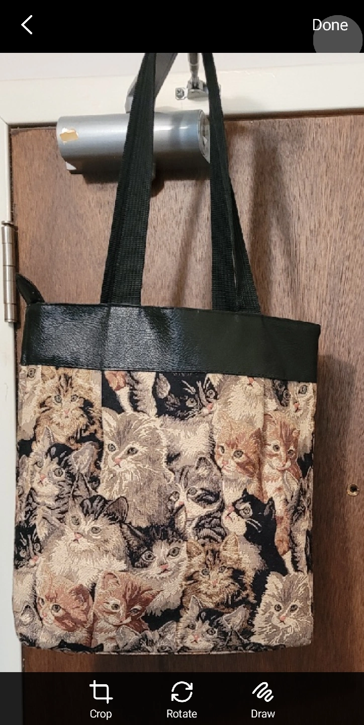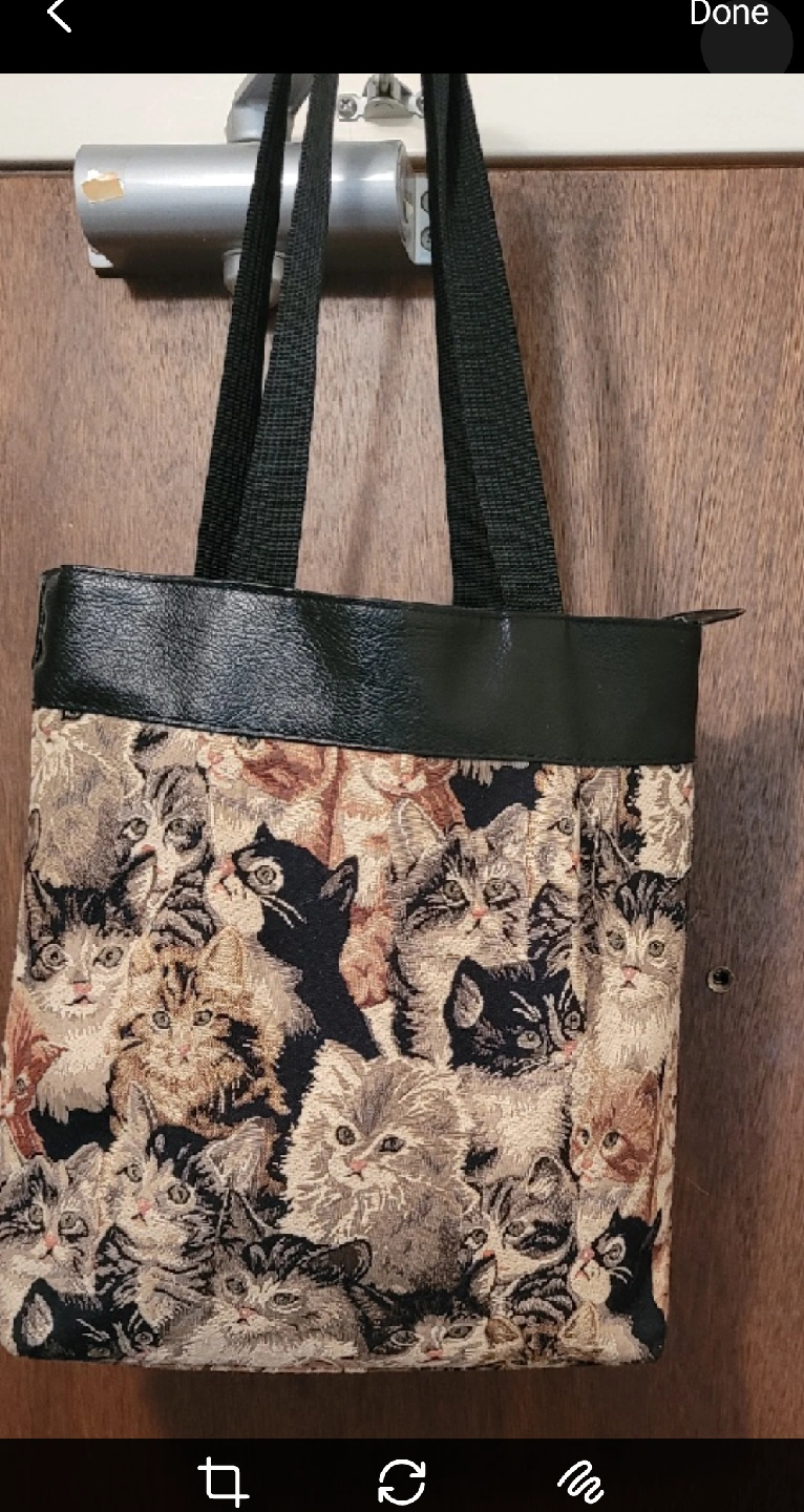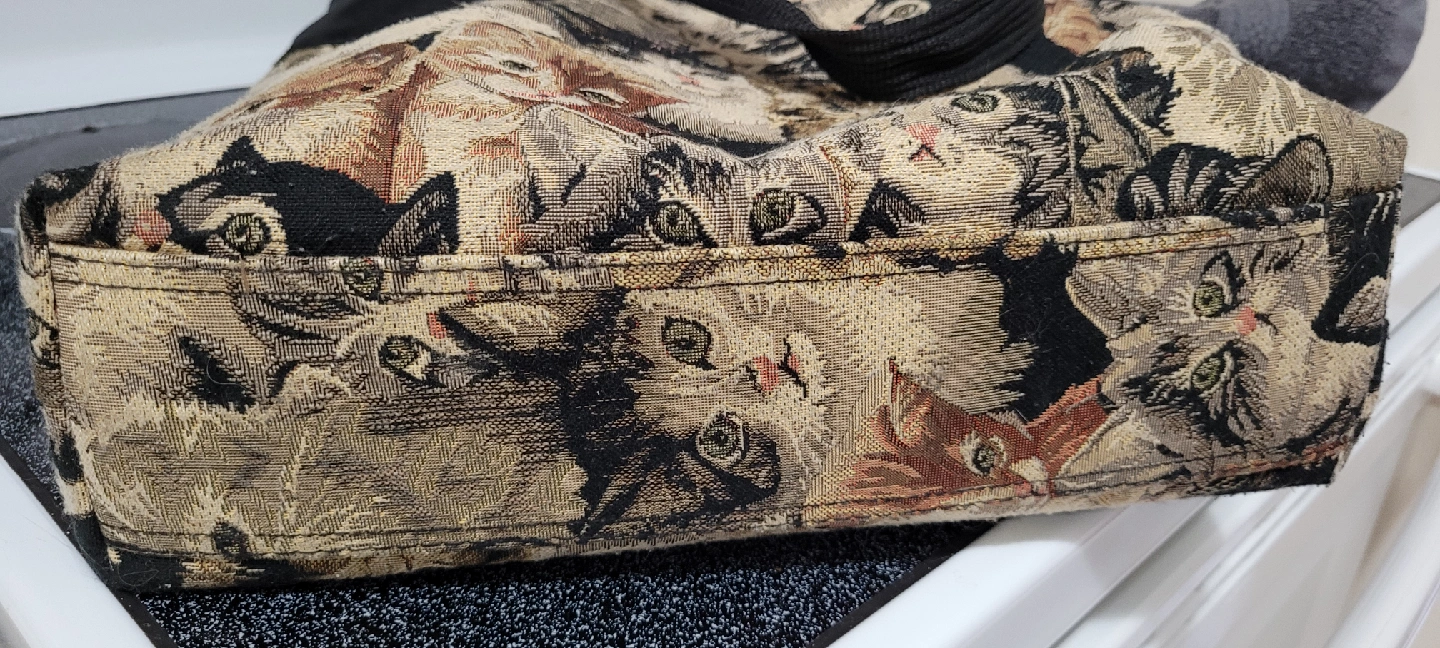 Here's a fun tote bag featuring a tapestry-style cat print! It has a black lining and black straps. It's in great condition and ready for a new home
