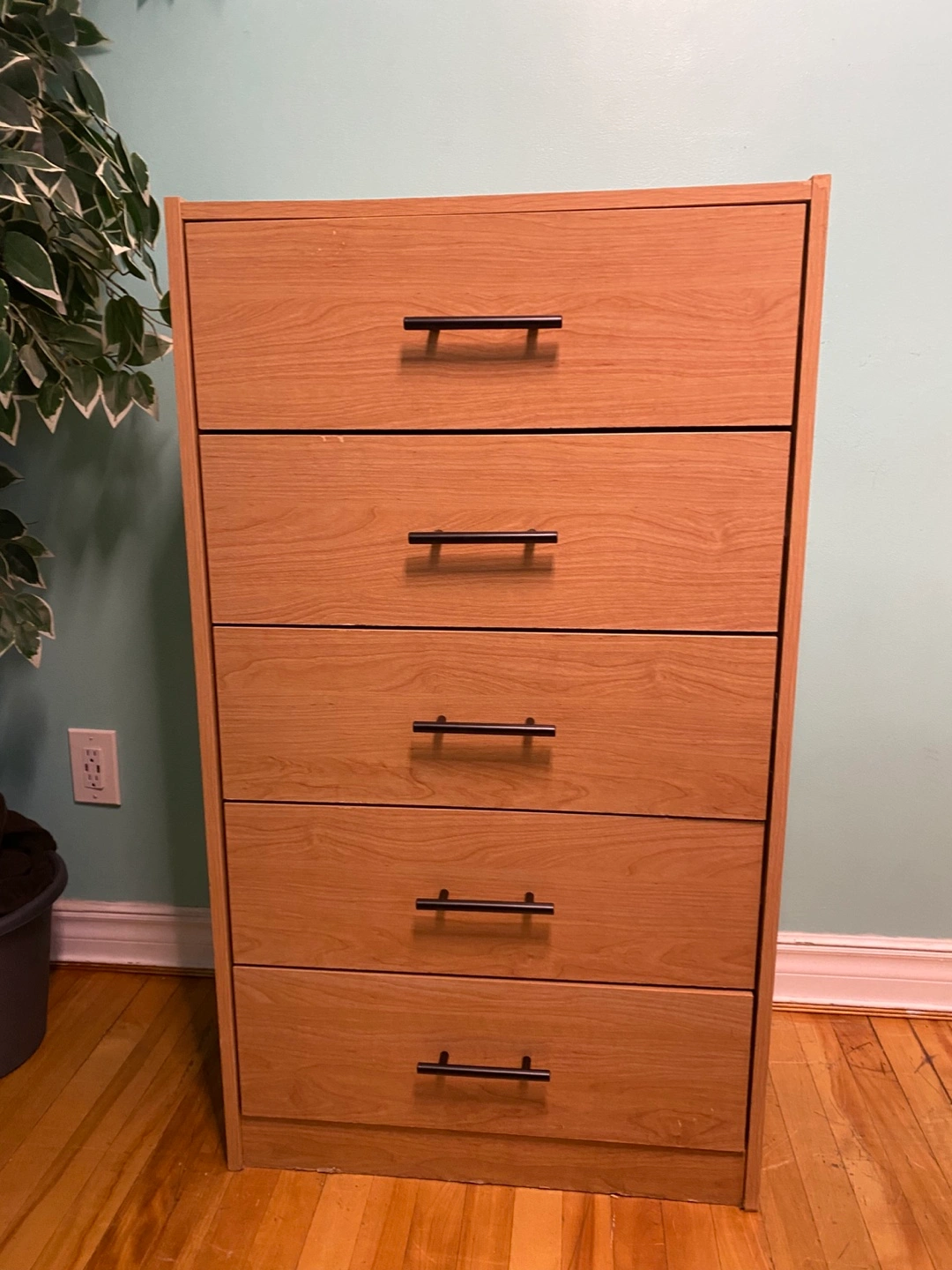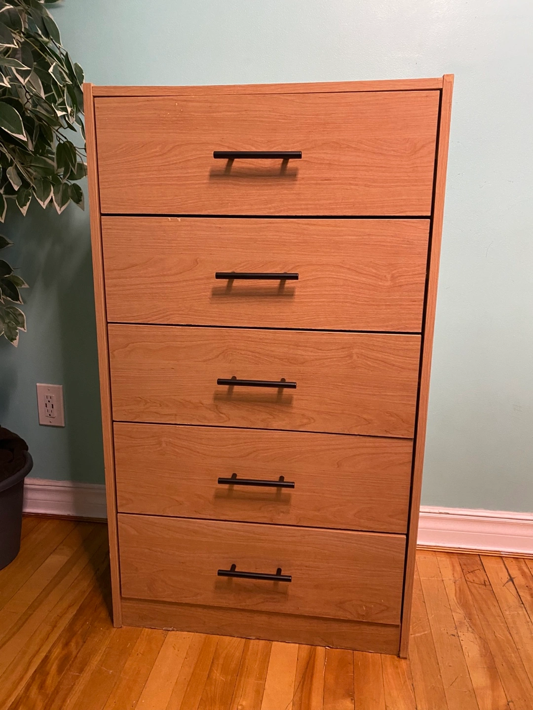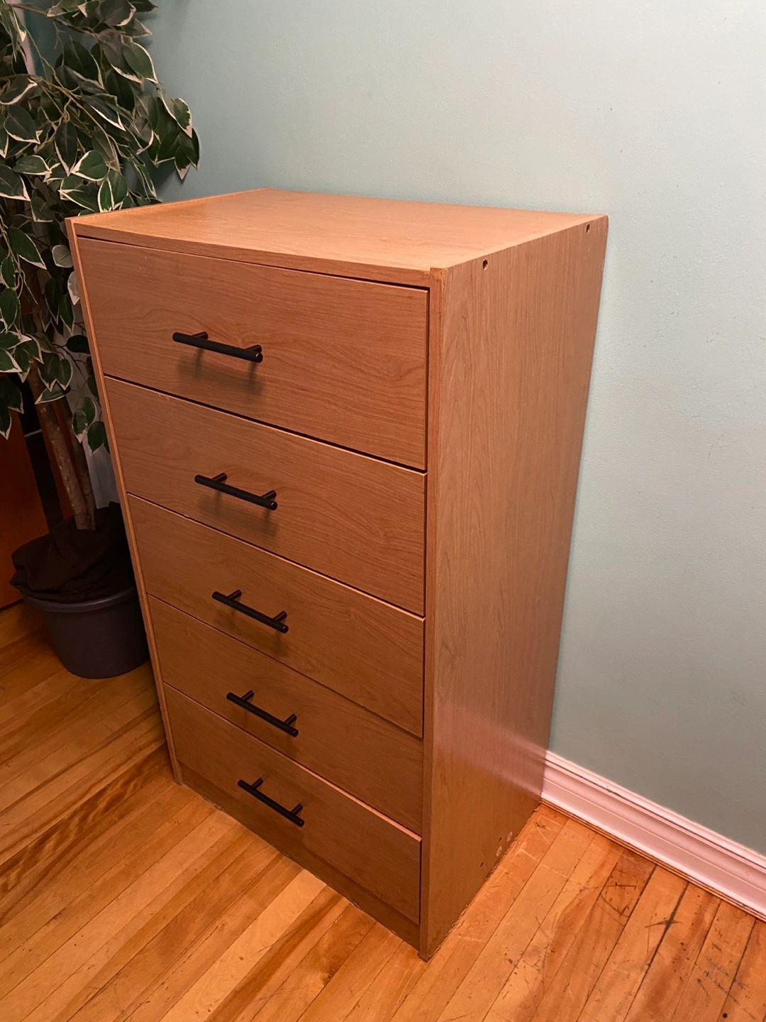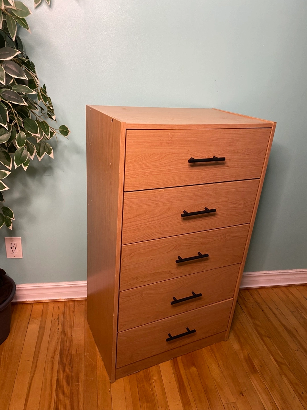 Tall dresser in great shape. Modern styling. All the drawers retract smoothly without any issues. All the drawers are clean. Smoke-free / pet-free with no odours. Delivery is included in the price, available throughout HRM. Right to refuse on delivery, you’re encouraged to check out and try out the dresser on delivery. $150 Exact Measurements: Height: 43.85 inches (or 3 FT & 7.85 inches). Width: 25 inches (or 2 FT & 1 inch). Depth: 15.75 inches (or 1 FT & 3.75 inches).