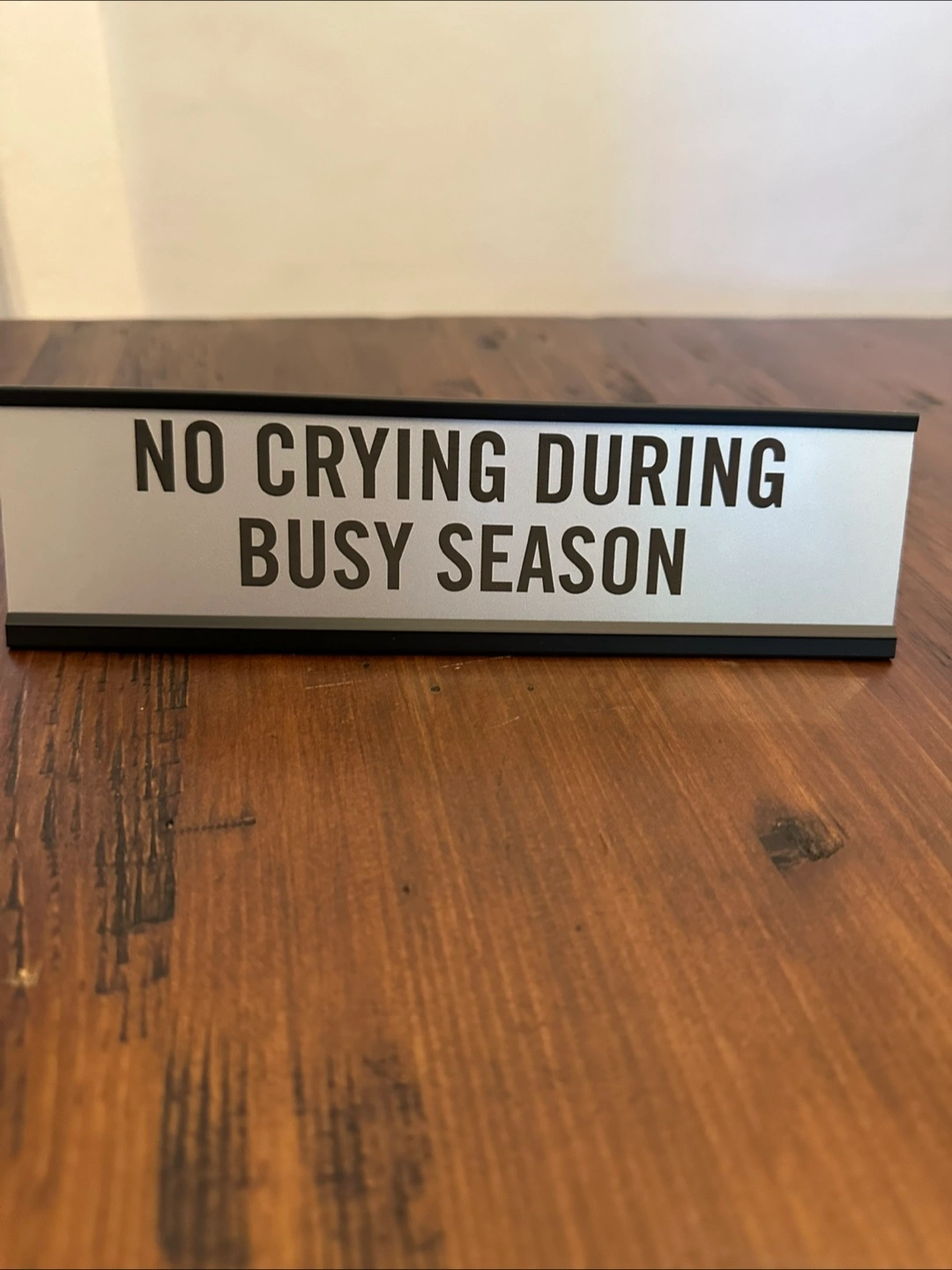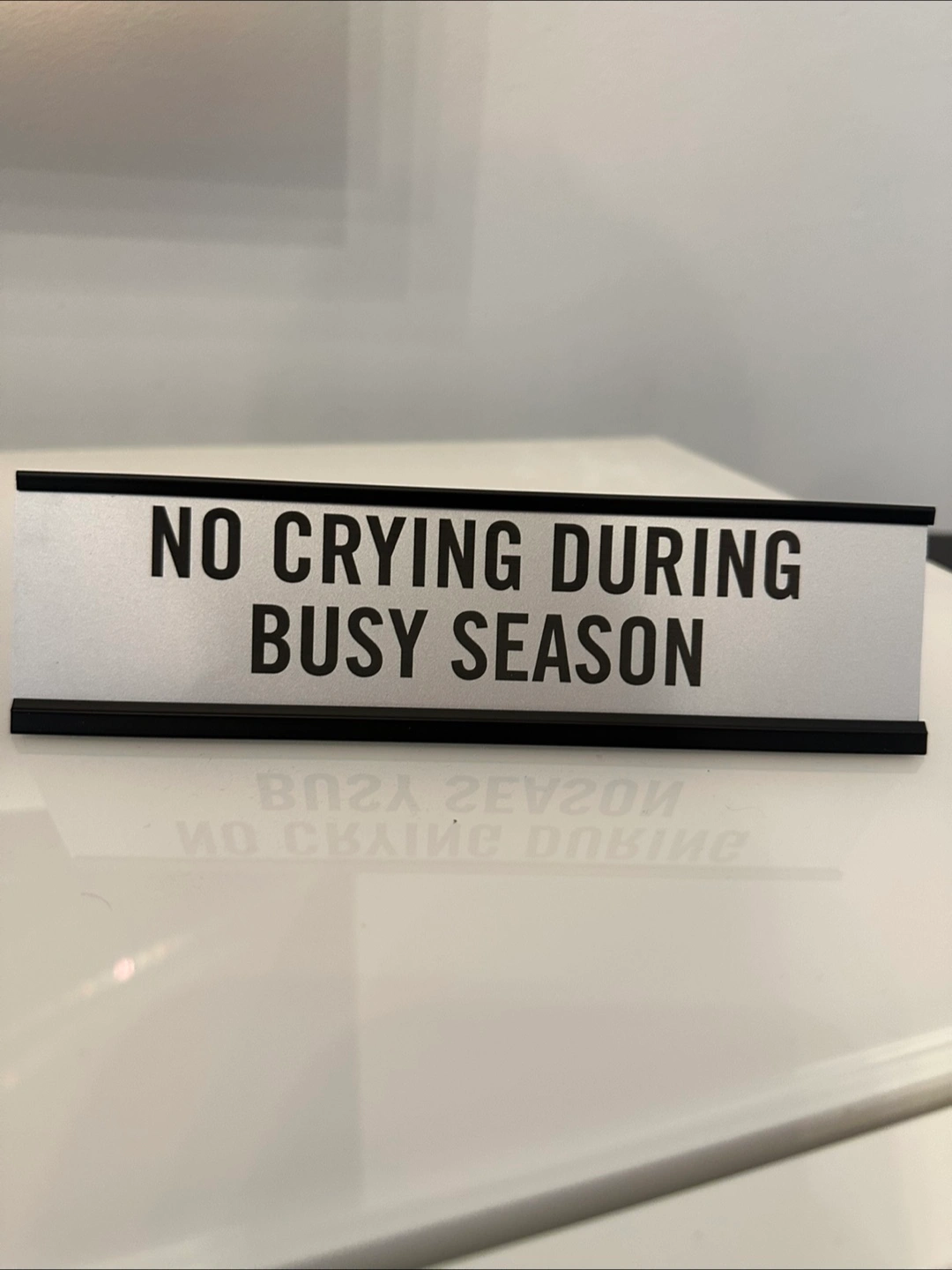 A funny desk sign that reads 'No Crying During Busy Season' to lighten the mood in your workspace. New, never used (it comes in the original shipping box).