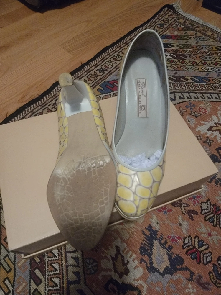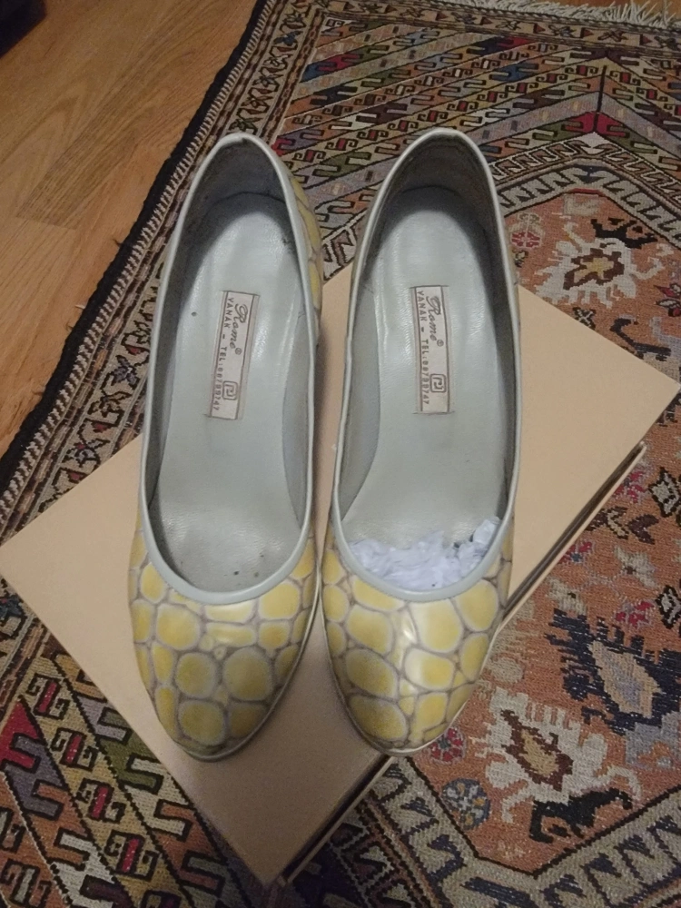 These yellow heels are from Rome Vanak! They feature a unique pattern and a classic heel shape. Perfect for adding a pop of colour to your outfit