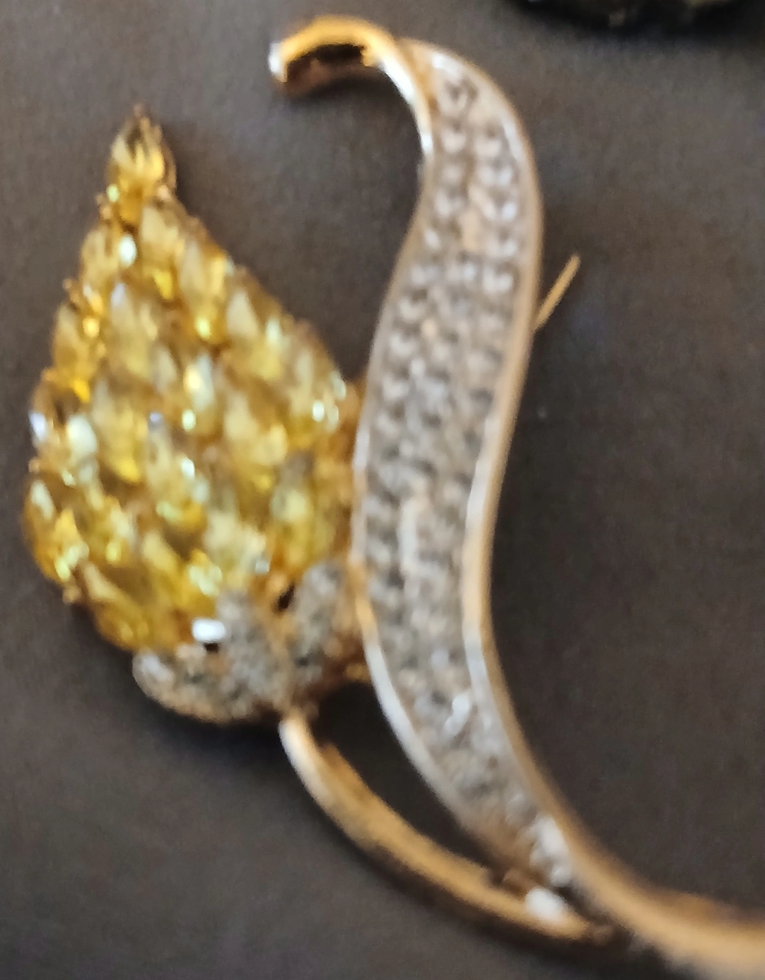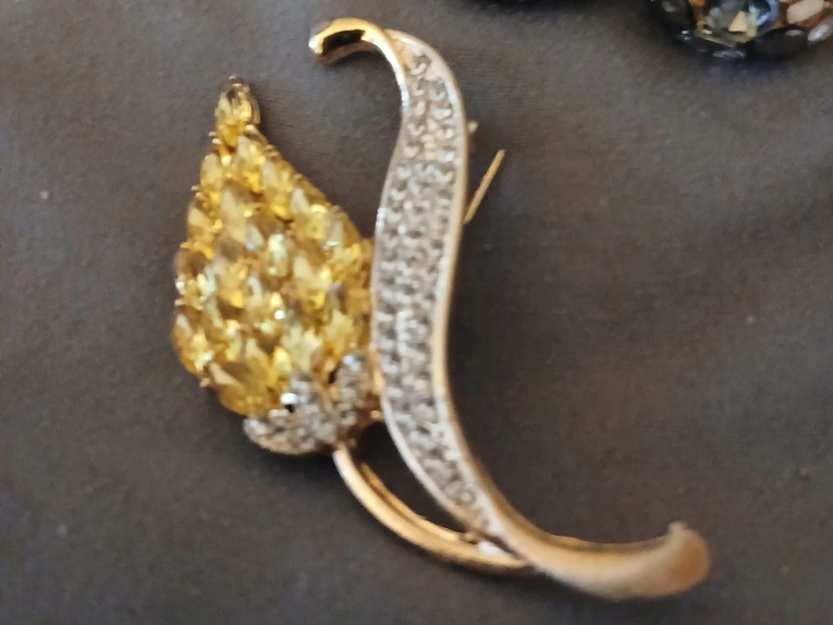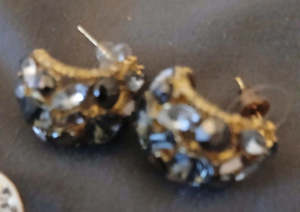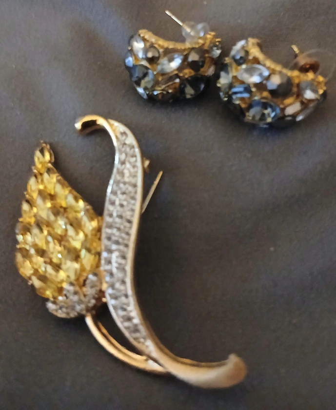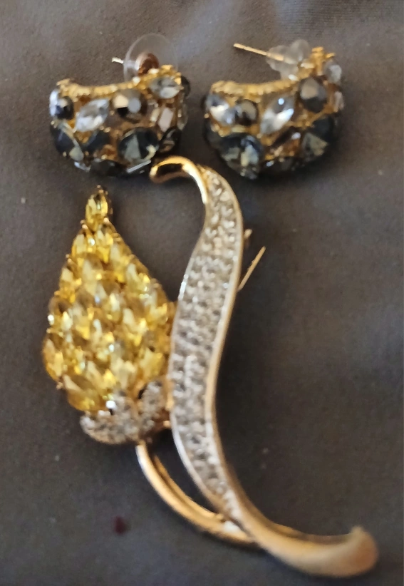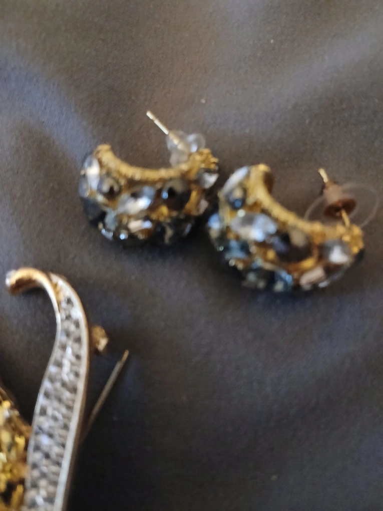Selling a set of earrings and a brooch. The earrings are gold-toned with grey and clear stones. The brooch is gold-toned with yellow and clear stones. They are in excellent condition chevk out other listings to $ave and bundle