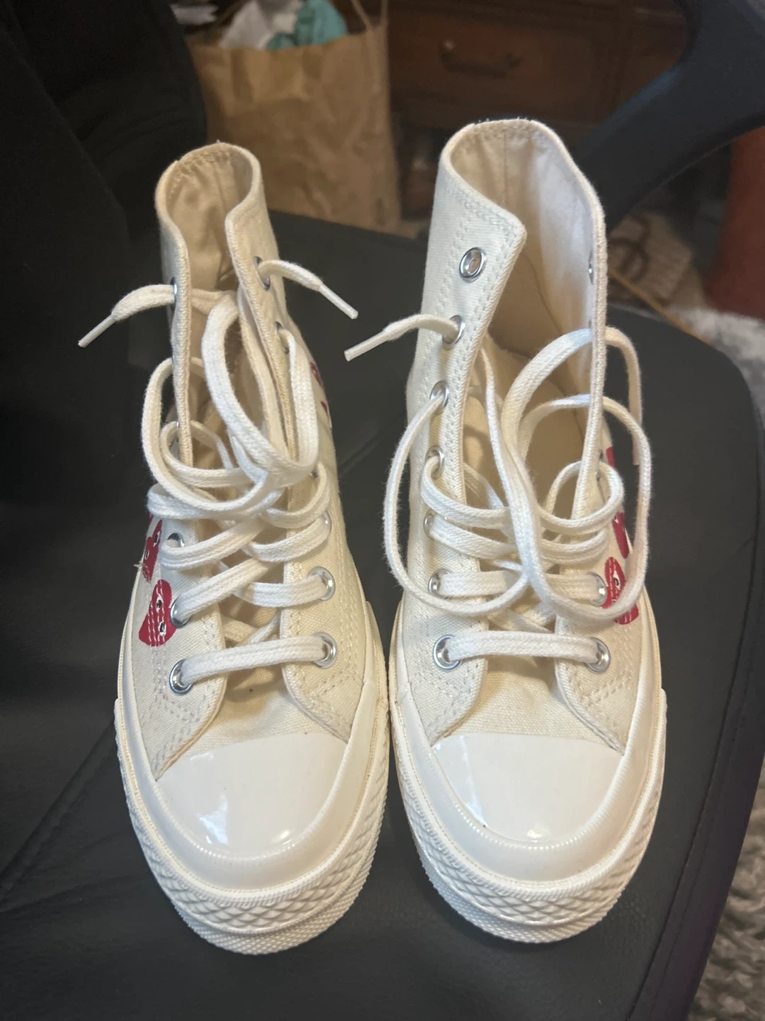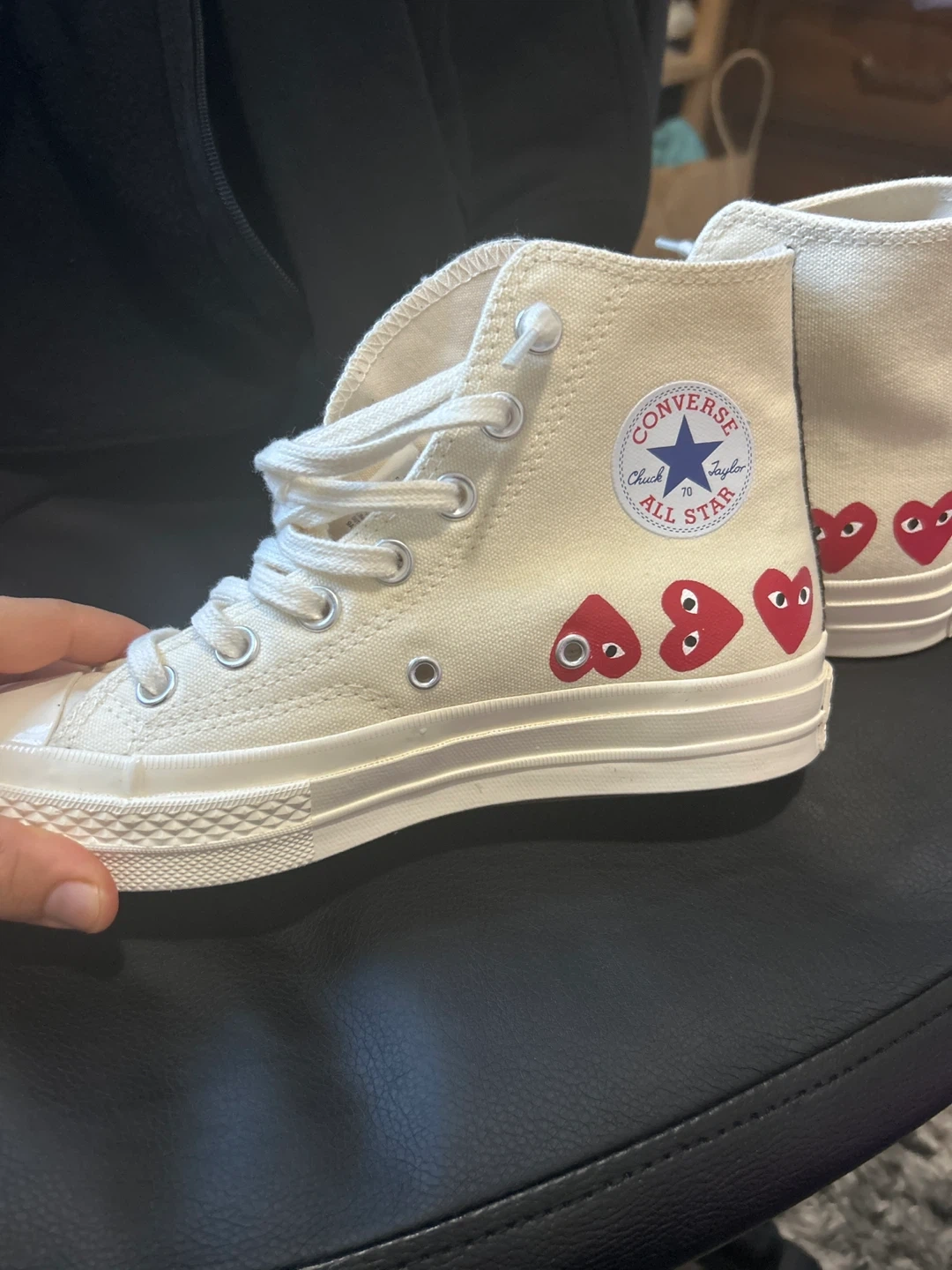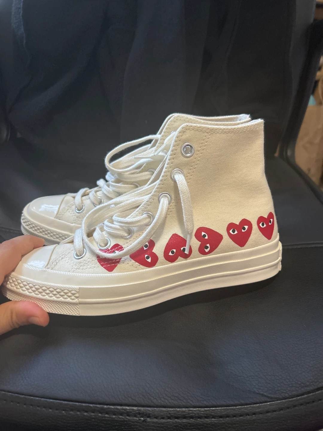 Selling a pair of Converse x Comme des Garçons PLAY Chuck 70 High sneakers! They are in excellent condition and feature the iconic heart-and-eyes logo. The size is US 4.