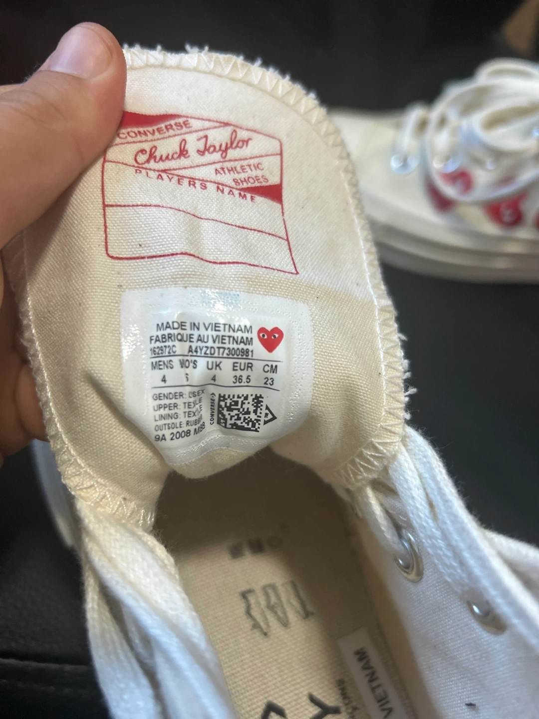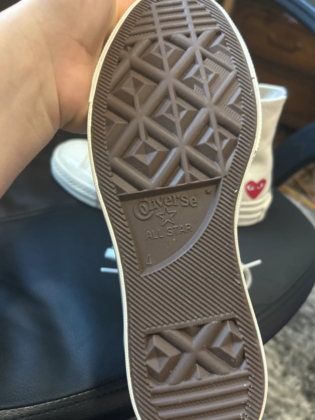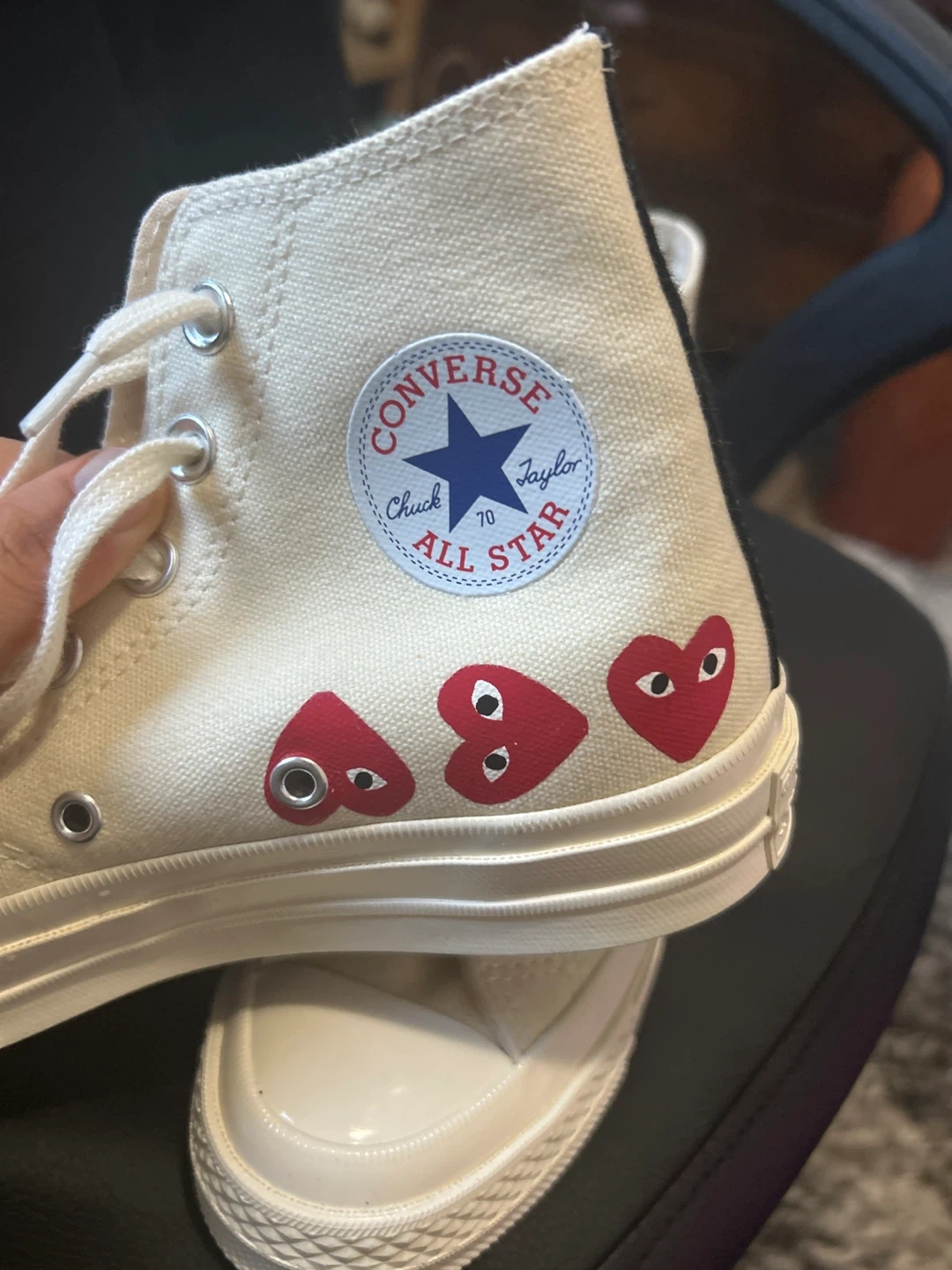 Selling a pair of Converse x Comme des Garçons PLAY Chuck 70 High sneakers! They are in excellent condition and feature the iconic heart-and-eyes logo. The size is US 4.