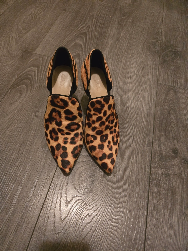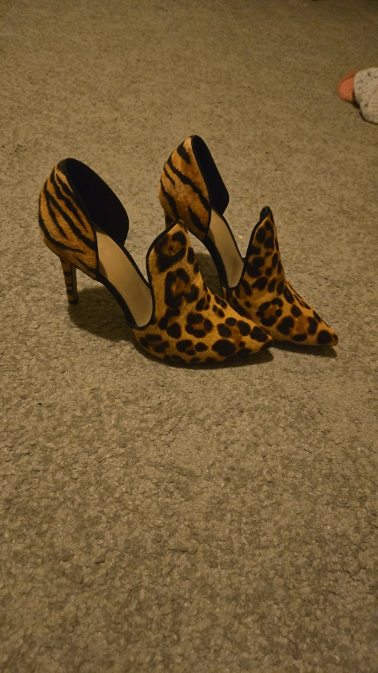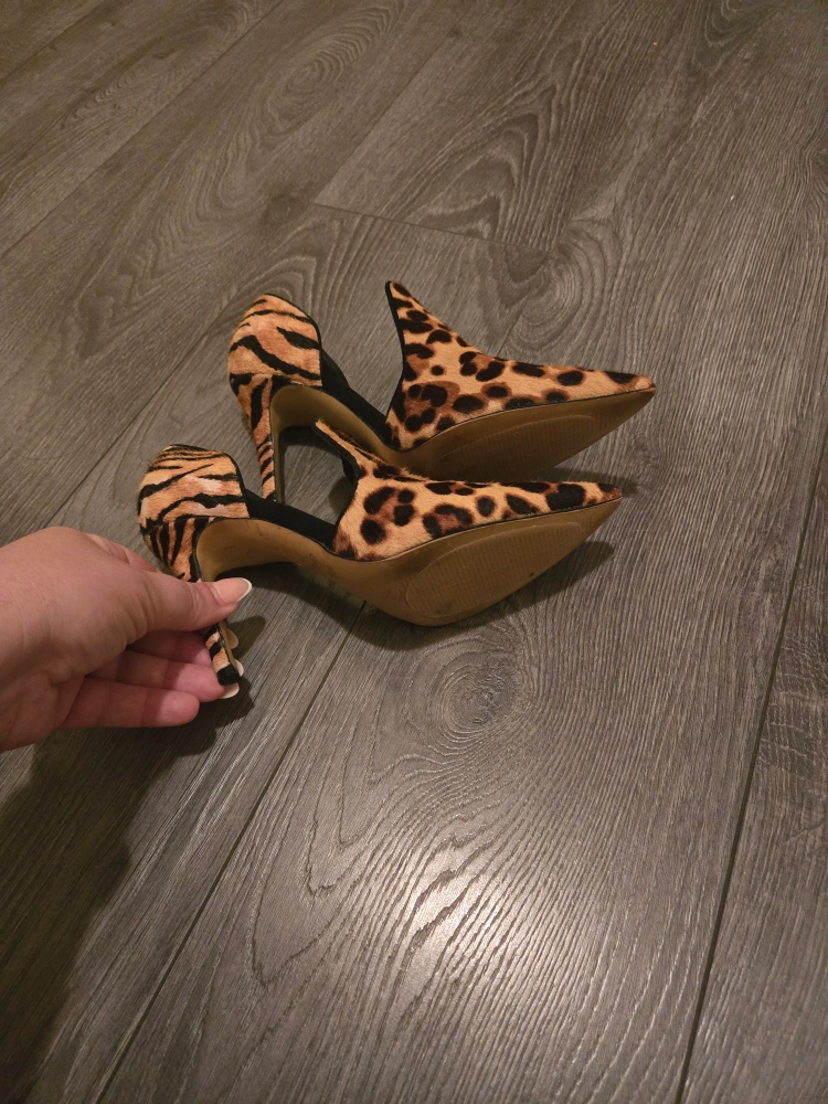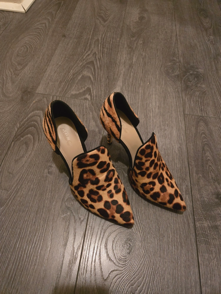 Selling a pair of gently used ALDO heels in a fun leopard print! They are a size 5 and feature a unique design with a tiger stripe heel. Perfect for adding a pop of style to any outfit