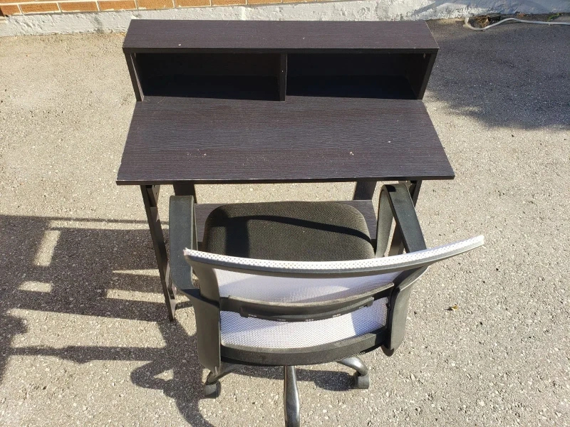 Selling a black desk and office chair set. The desk has a shelf on top for extra storage. The chair is black with a white mesh back. It's in good condition and ready for a new home! Great for students in any grade.