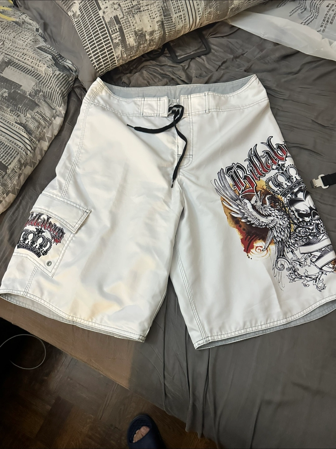 Selling a pair of Billabong board shorts Swim Trunk in white. They feature a cool eagle and skull design. Perfect for swimming. Size: 34.