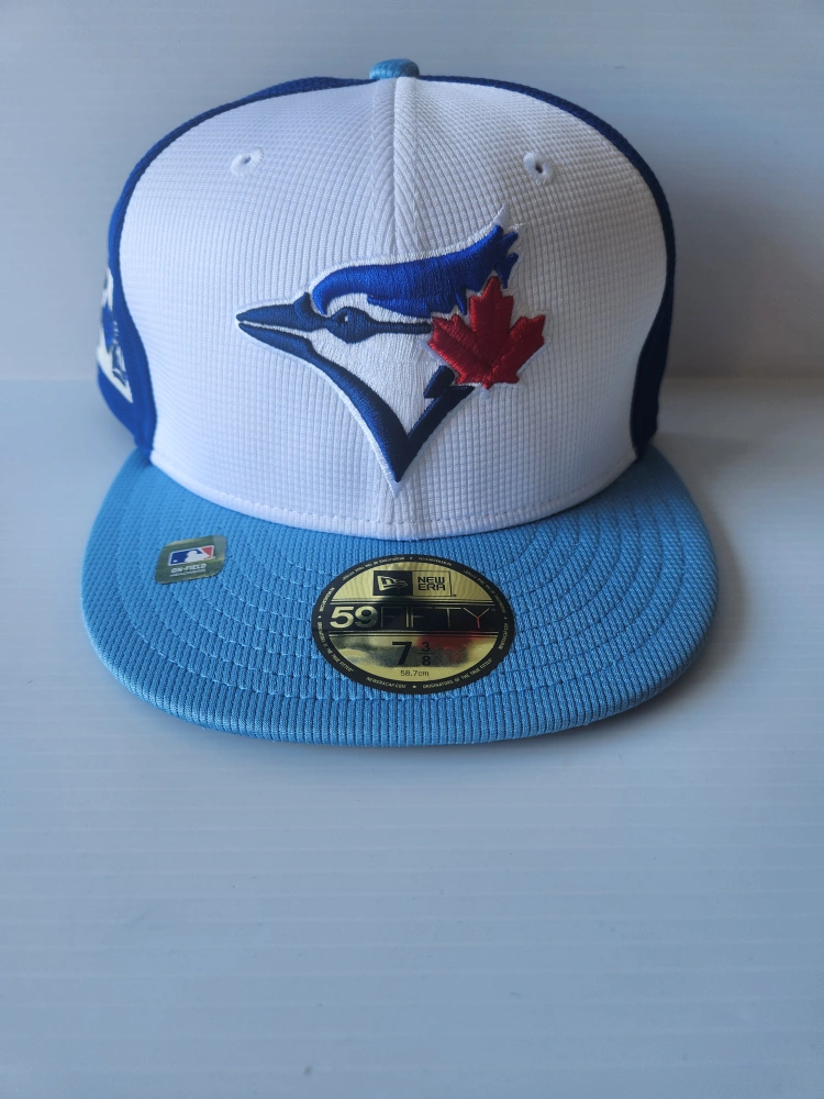 Selling a New Era Toronto Blue Jays fitted hat. It's a size 7 3/8. Originally bought for $69.99. The hat features the Blue Jays logo with a Maple Leaf.