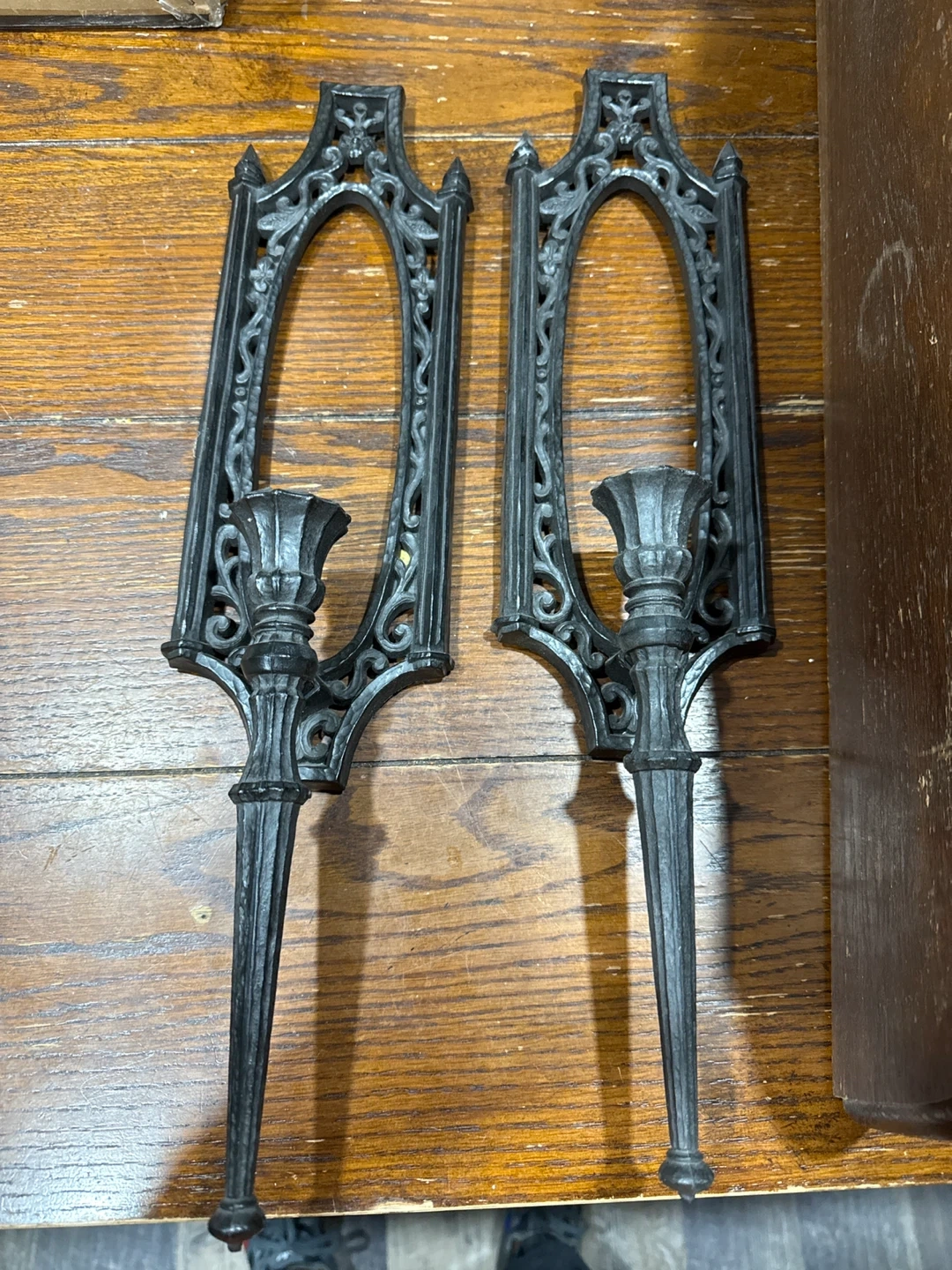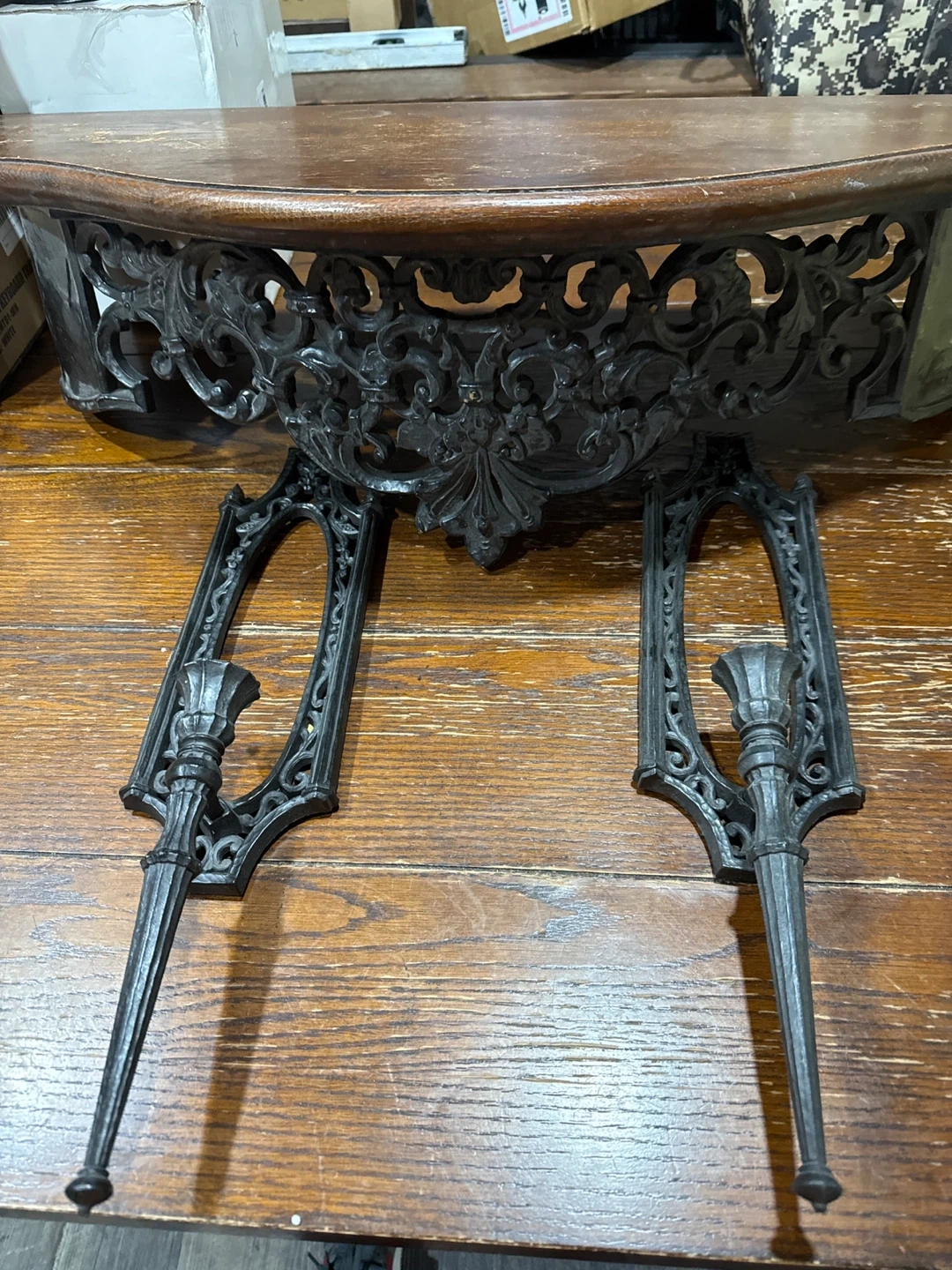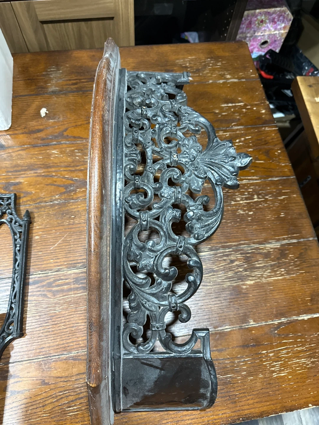 Selling a unique wall shelf with a cast iron and wood construction. The ornate details give it a vintage look. Perfect for adding a touch of elegance to any room!