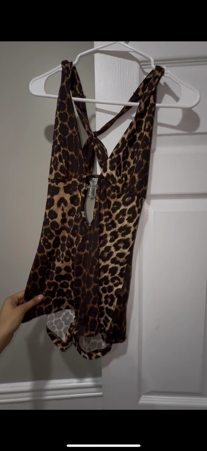 This bodysuit is a stylish statement piece with a bold leopard print. It features a halter neckline and an open back design. Perfect for adding a touch of wild flair to your wardrobe! Never worn before Super cute for going out