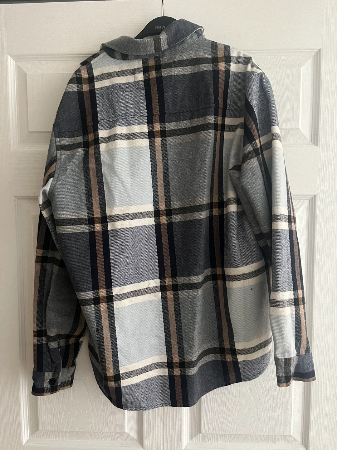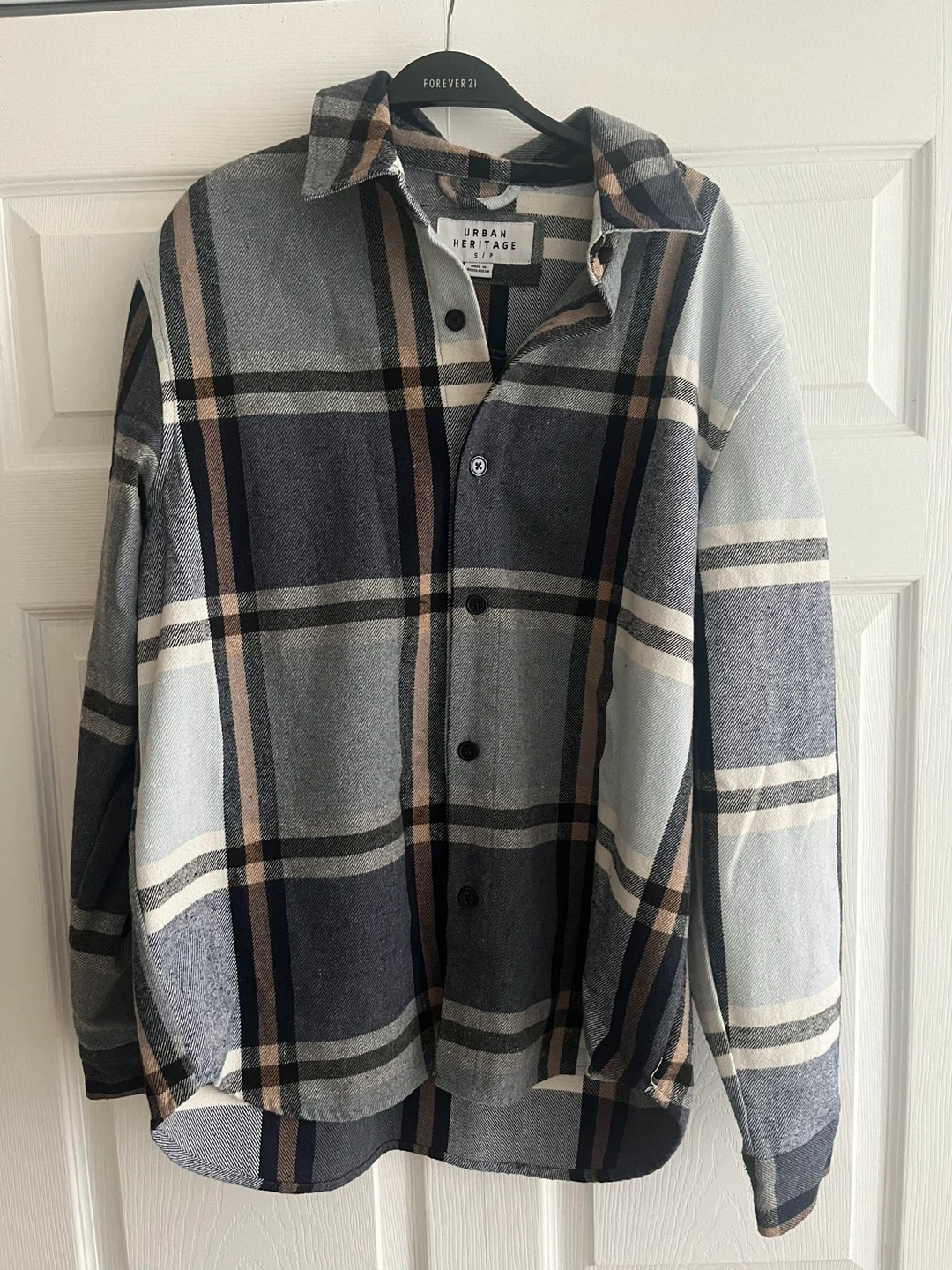 Here's a stylish Urban Heritage flannel shirt in size medium! It features a classic plaid pattern with a blend of grey, white, and brown tones. Perfect for layering or wearing on its own, this shirt is a great addition to any wardrobe