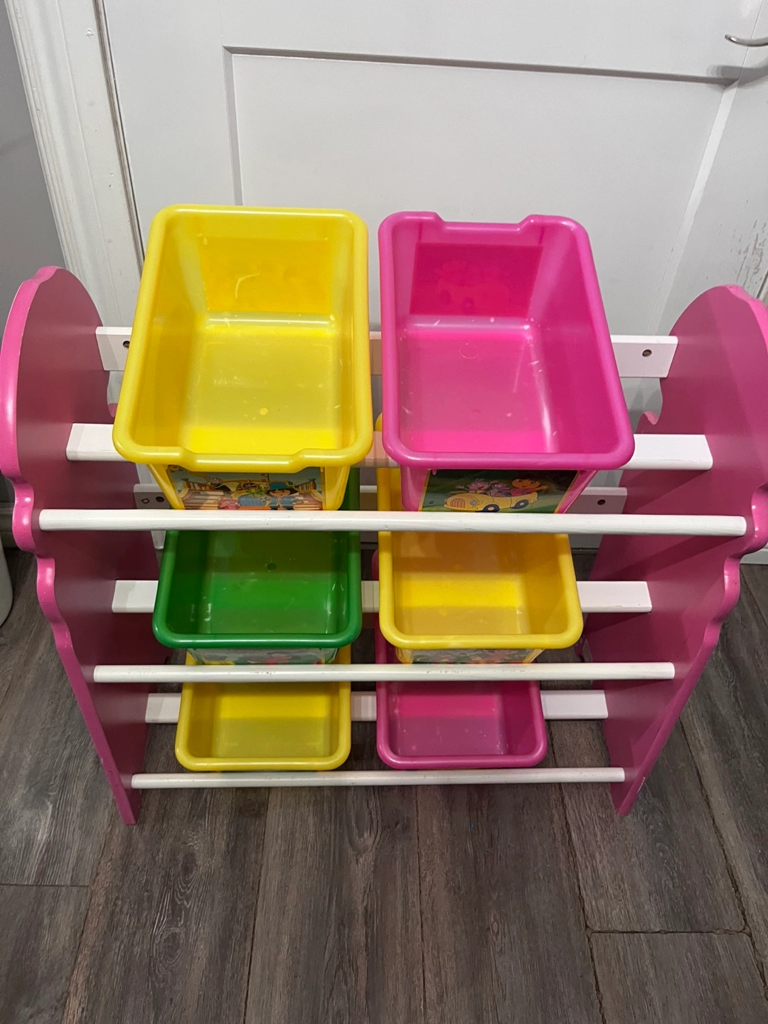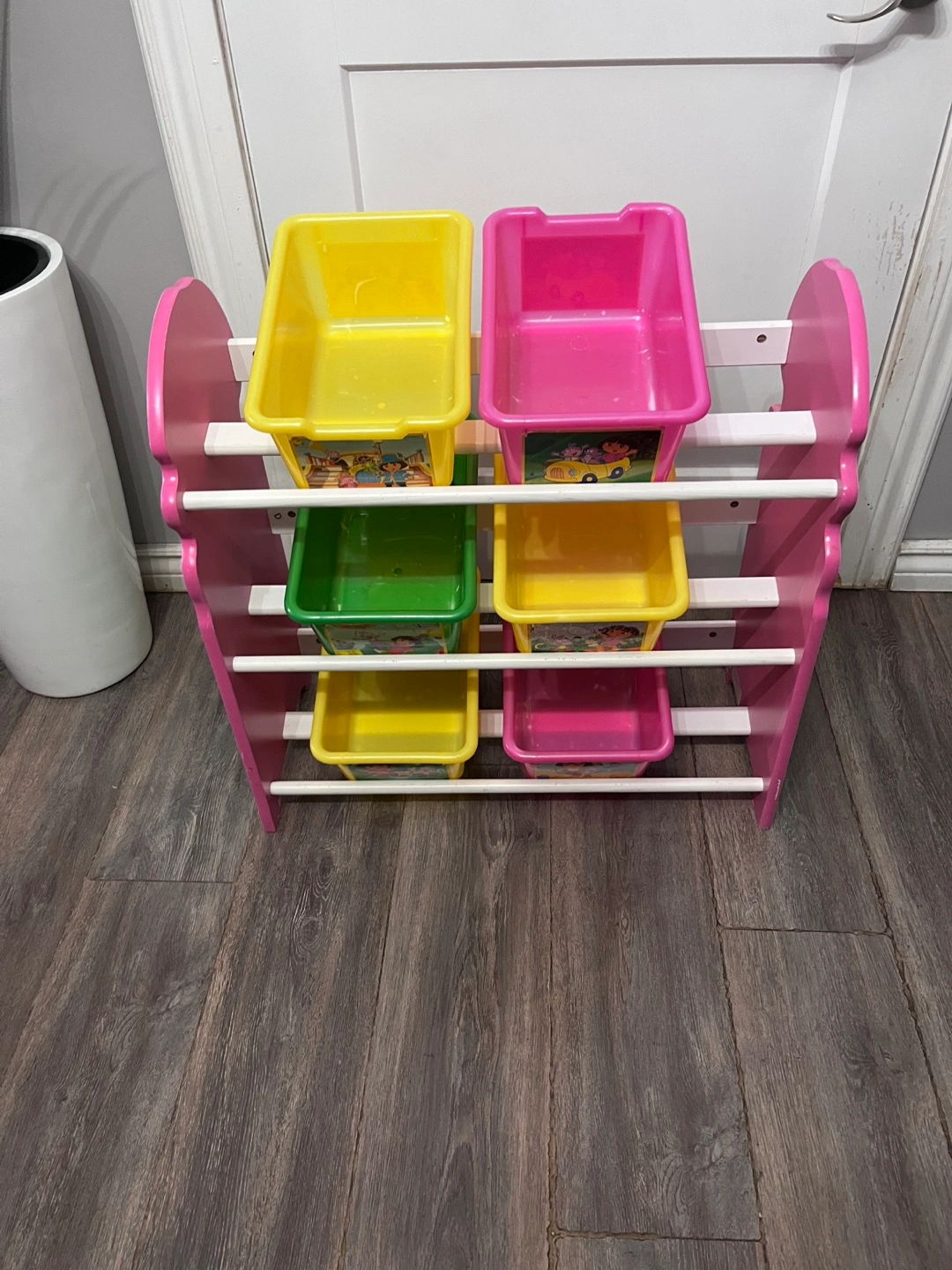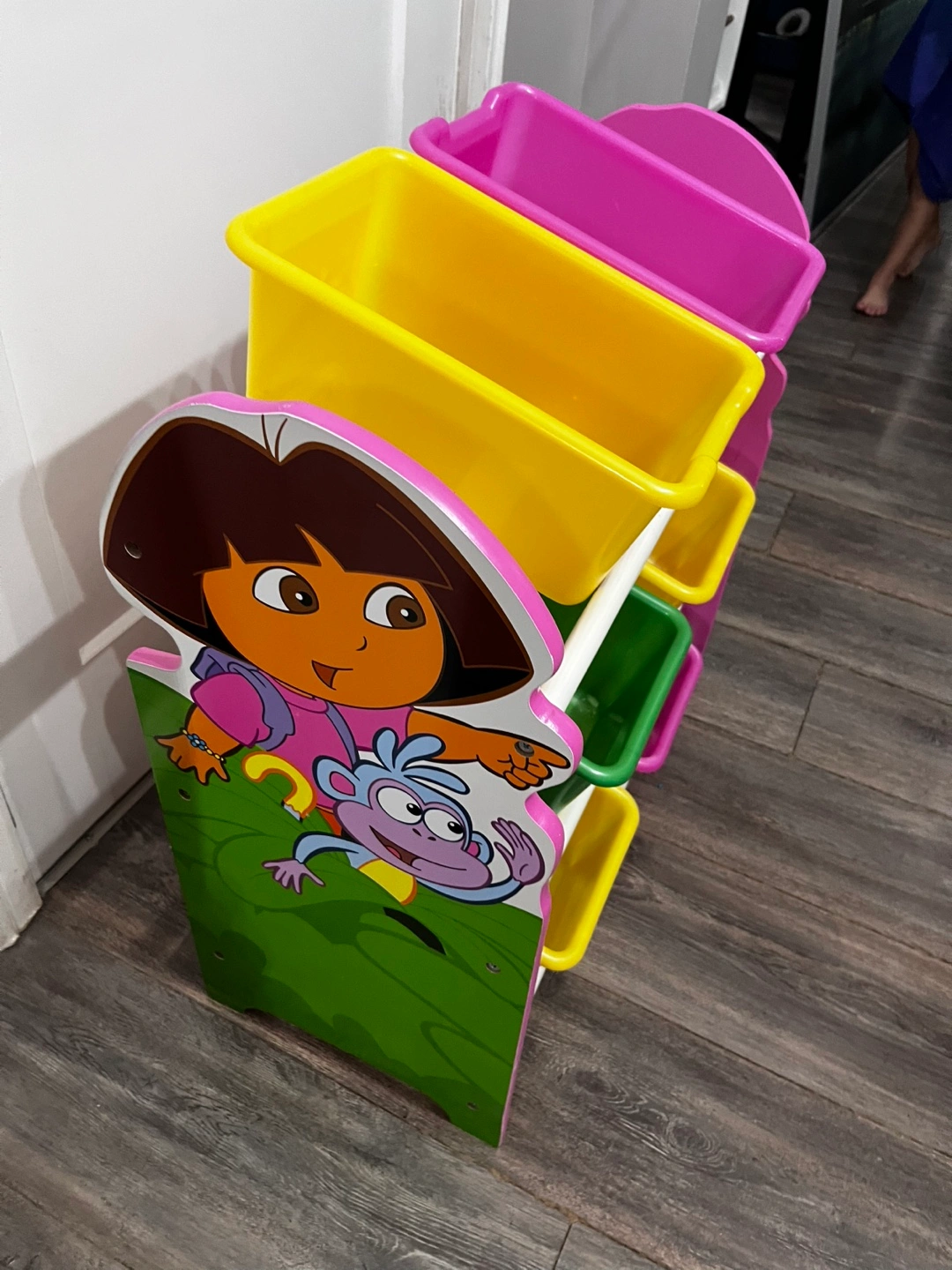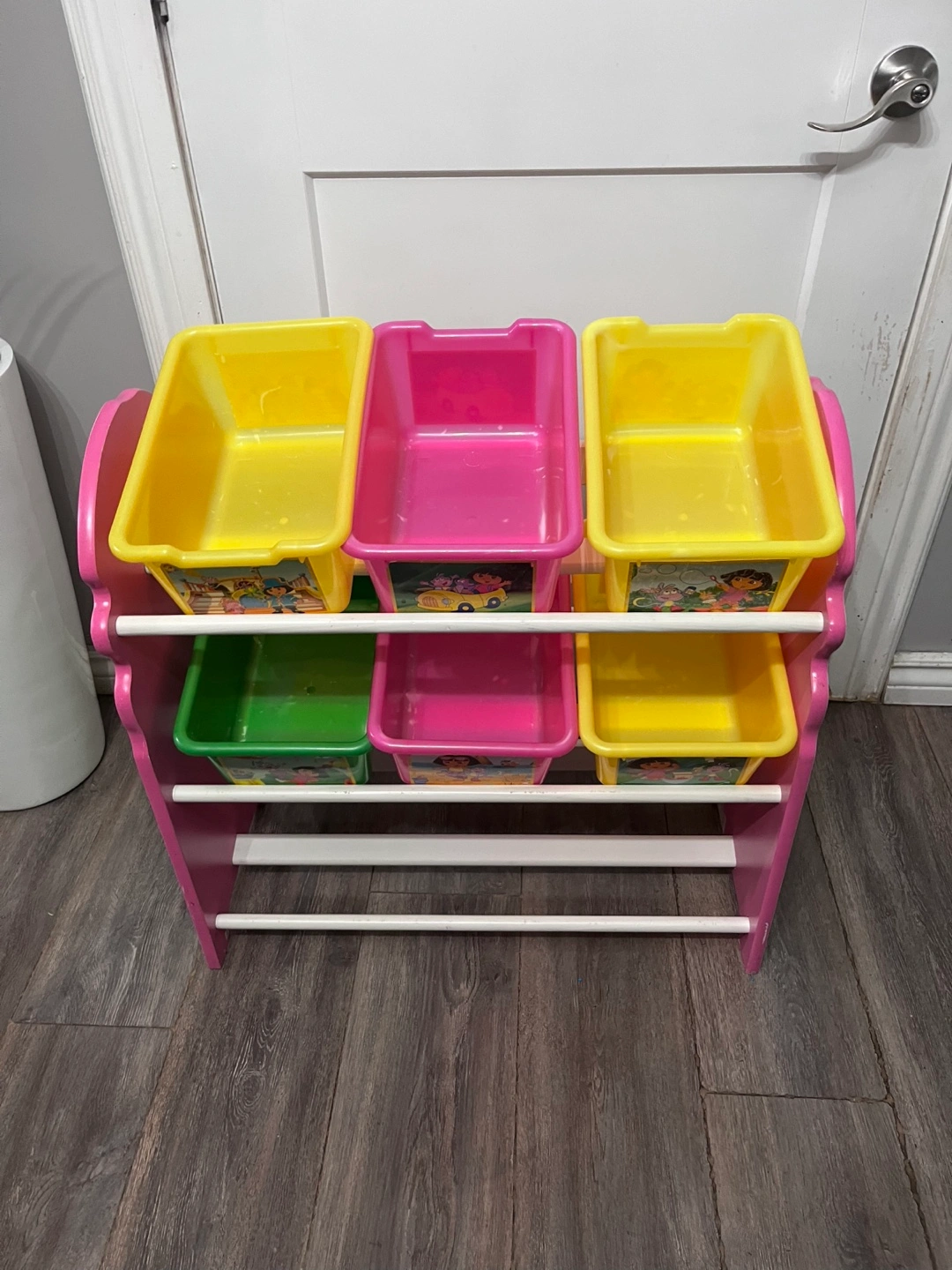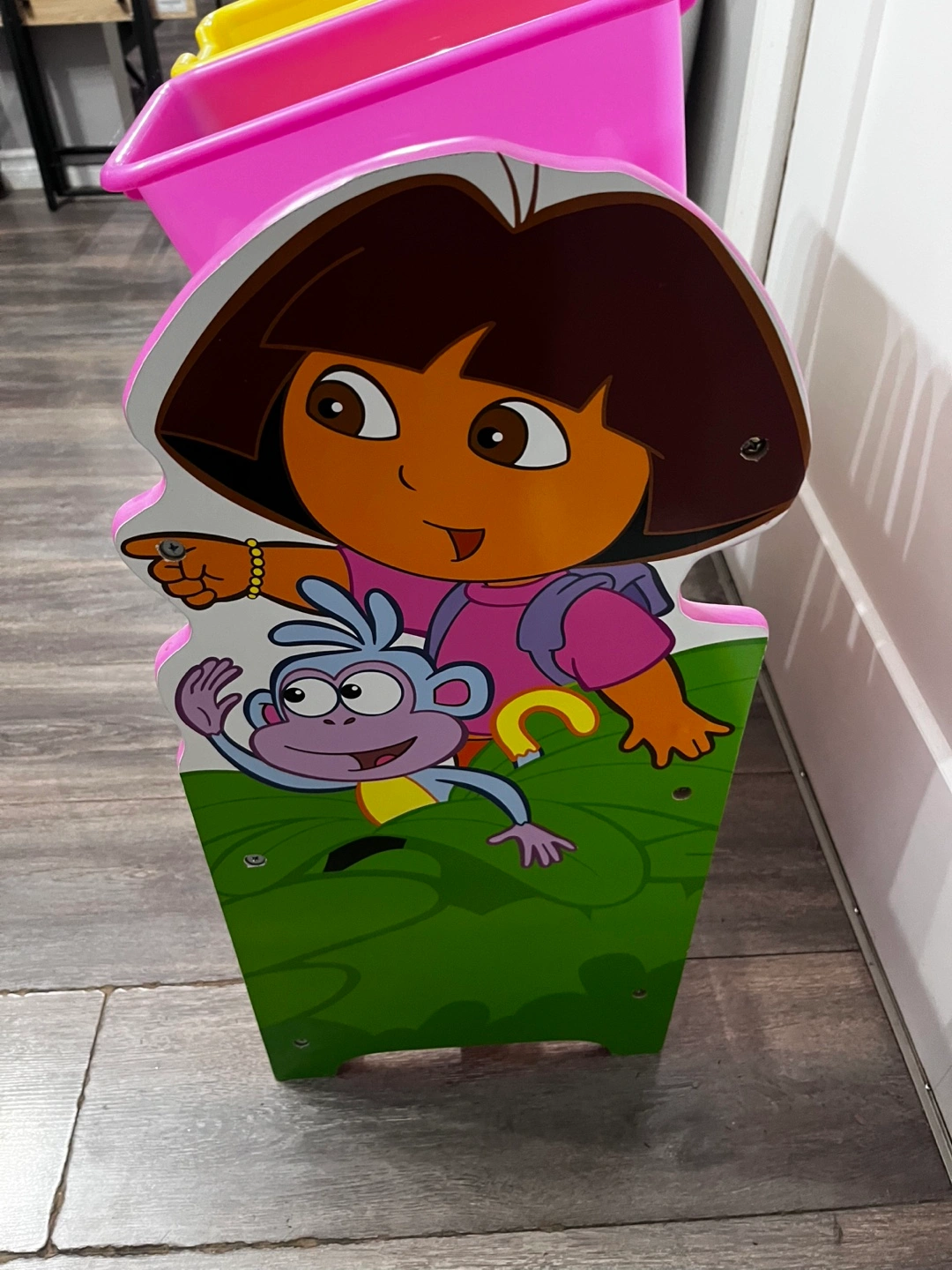 Here's a fun Dora the Explorer toy organizer! It features colourful bins in yellow, pink, and green. Perfect for keeping your little one's toys neat and tidy. Measures at 11.5βD x 26βH x 25.5β L Pick up only. Closest intersection is Jane st and Eglinton Ave.