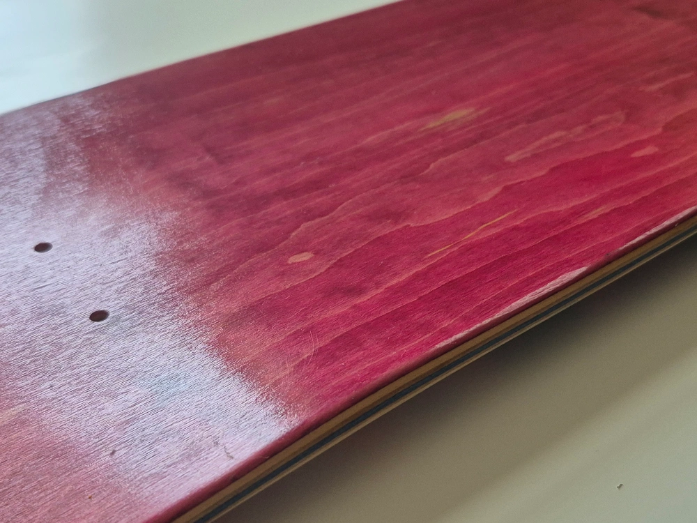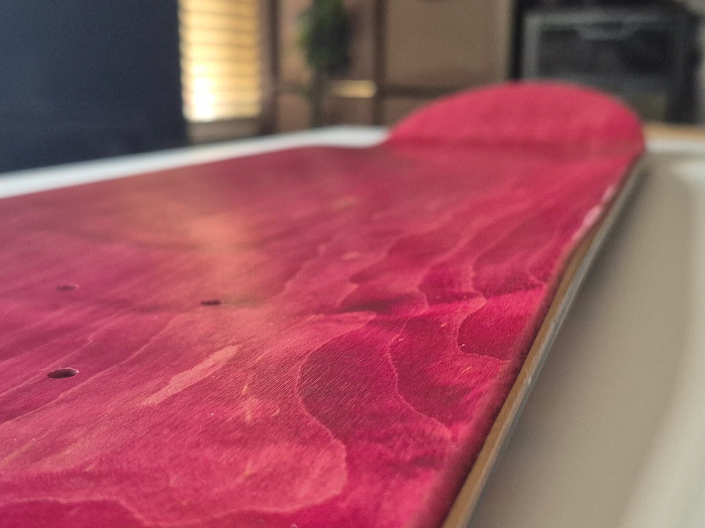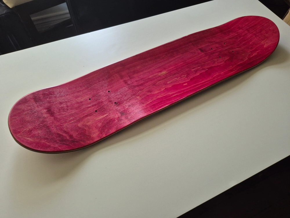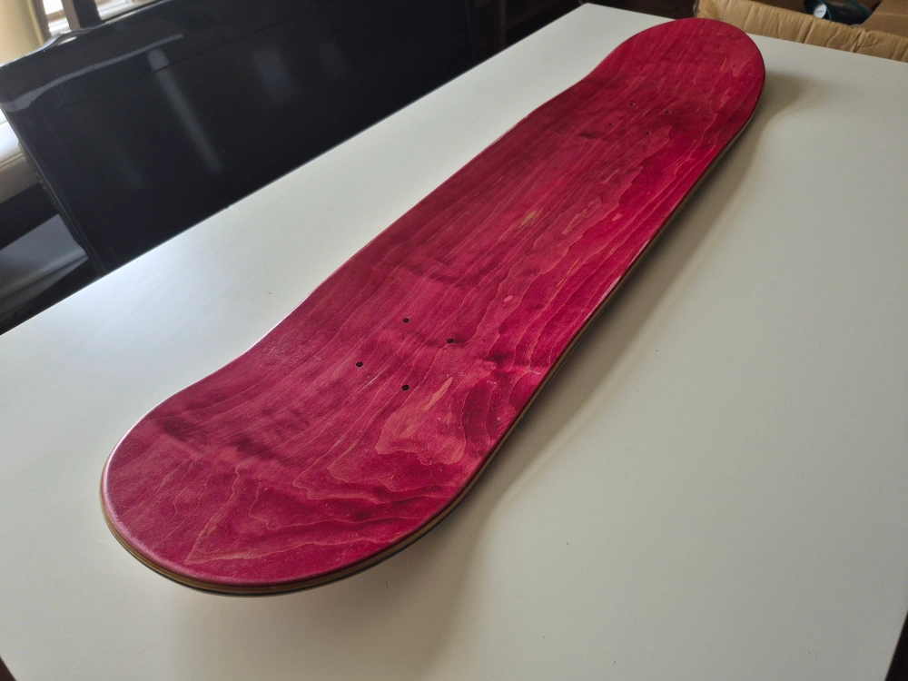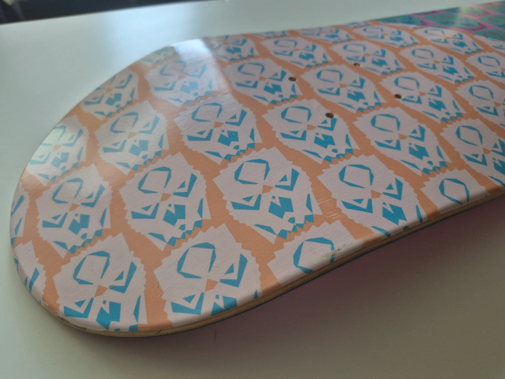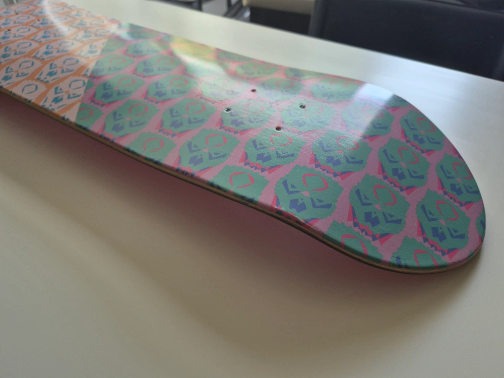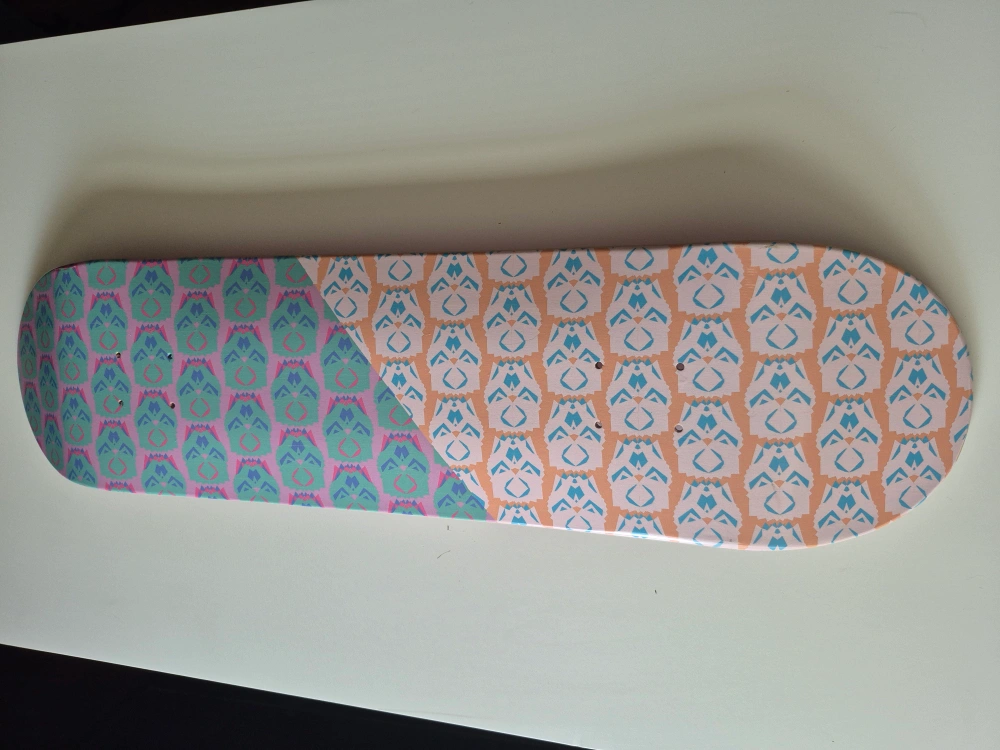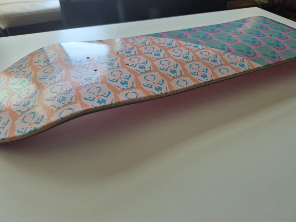 Selling a skateboard deck featuring a unique graphic design. It has a mix of orange and pink hues with a repeating pattern. The other side is a solid red colour! Perfect for customizing your ride. AI wrote this cause i'm very lazy today, any questions please ask away. Thanks!