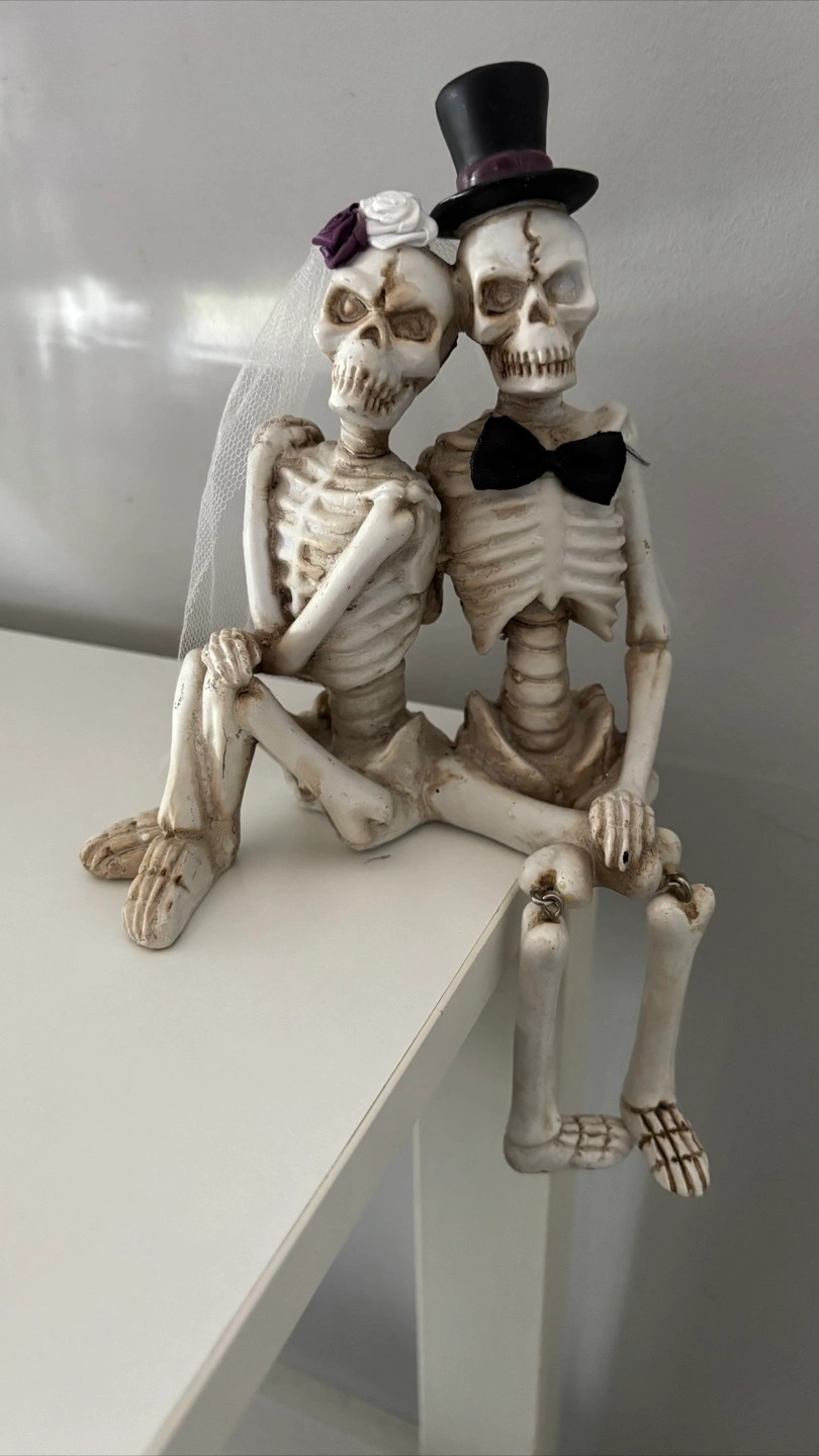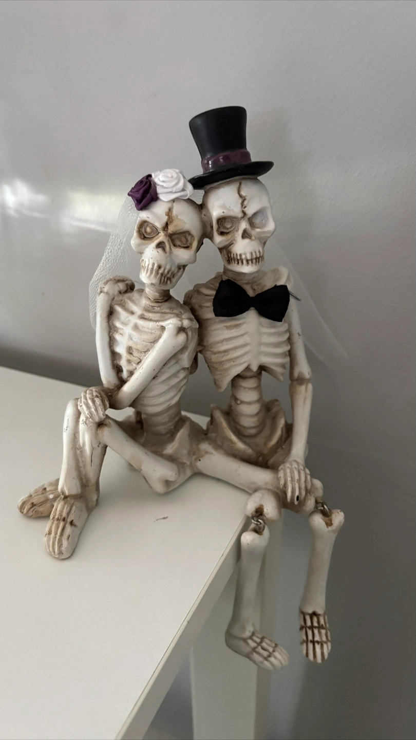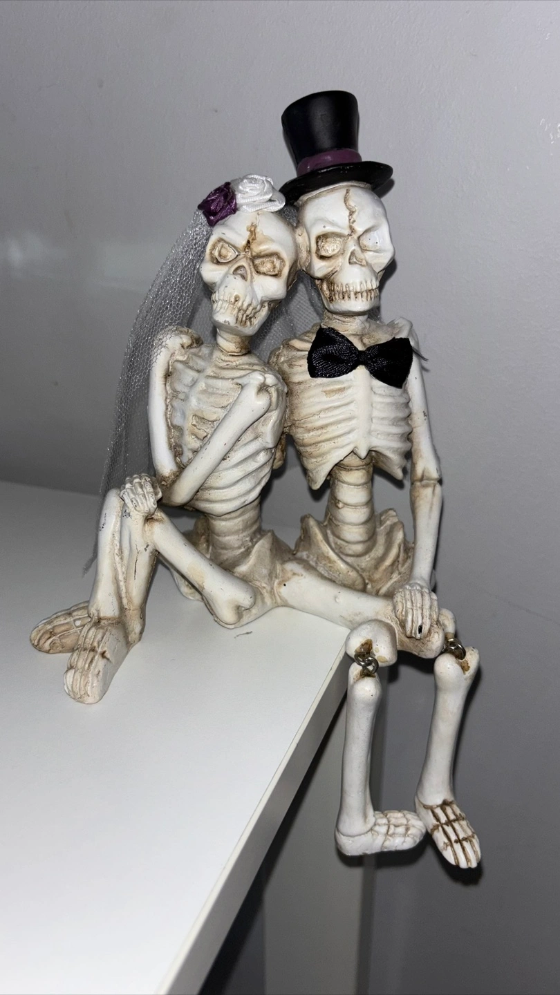 Charming skeleton bride and groom figurine. Features a whimsical design with a top hat and veil. Perfect for Halloween or themed decor. •Like New No Flaws